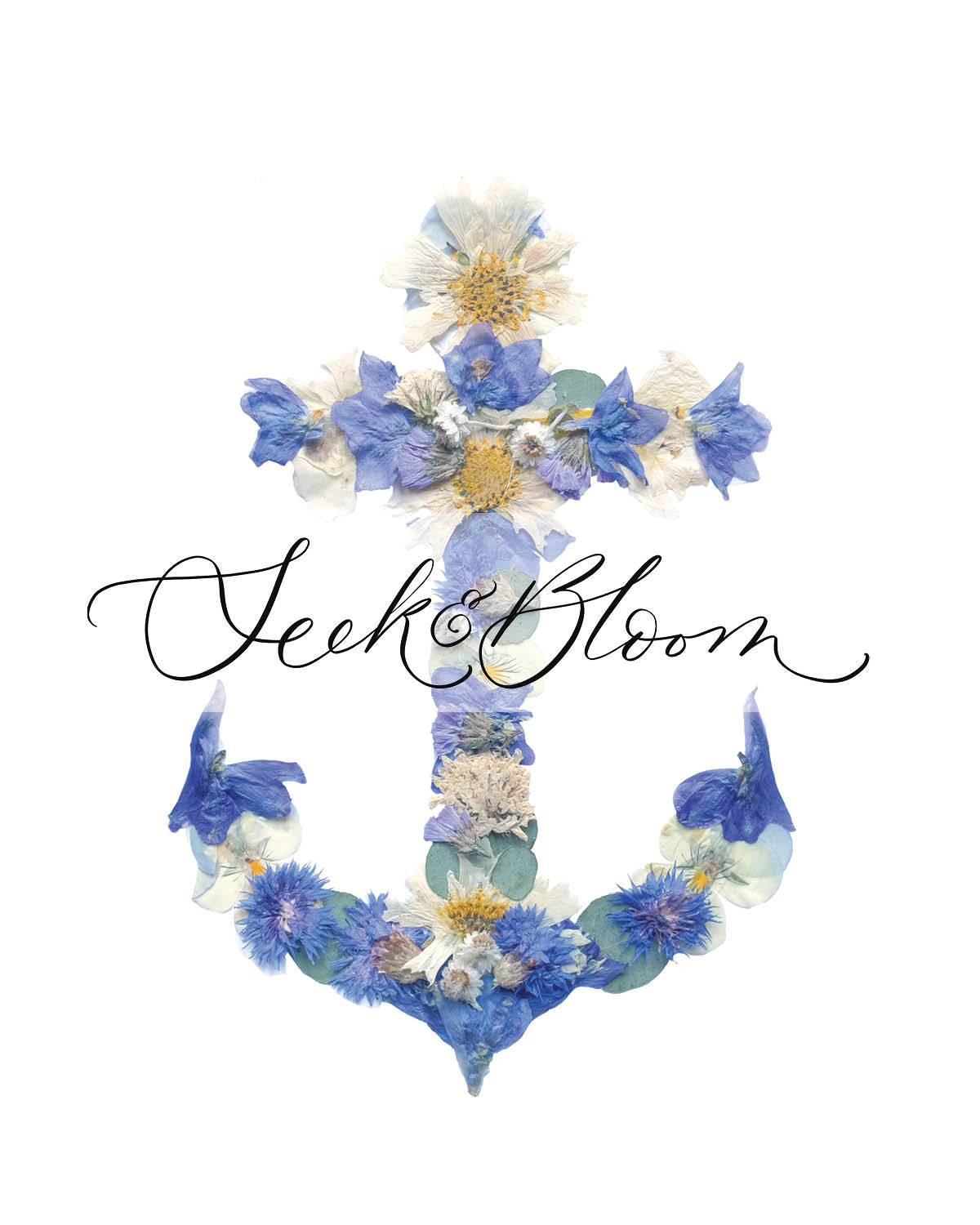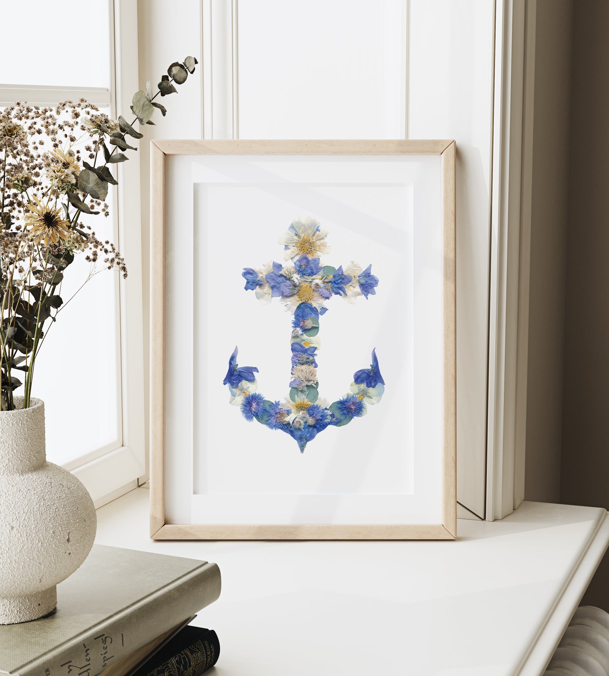Pressed Flower Blue and White Flower Anchor artprint, perfect for nautical theme decor and cottages.