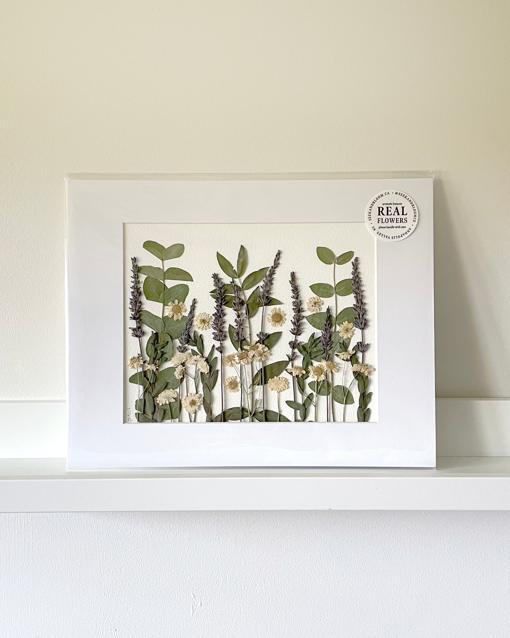 Flowers have been locally grown with lots of love and preserved to hold their colour as long as possible. Please remember that the flowers will develop more character over time and eventually fade. To hold the colour of your artwork longer, keep your artwork out of direct sunlight and prevent any moisture from getting to them within the frame. Sunny living spaces and bathrooms may change the way your flowers age over time.