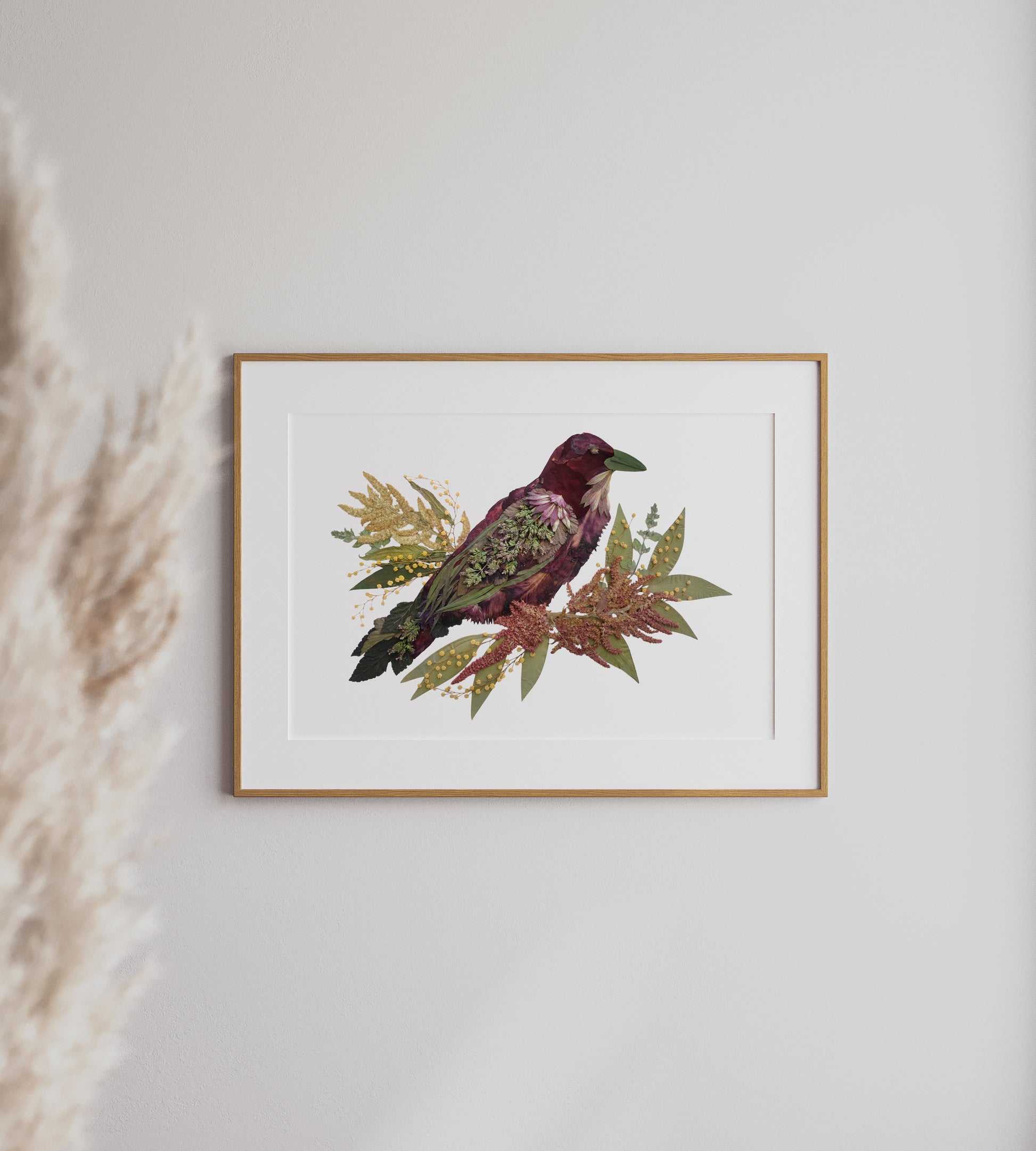 The crow is a powerful presence in nature, symbolizing intelligence, mystery, and transformation. This artwork captures its striking form using deep-hued petals and rich textures. Created with locally grown tulip, rose, and dahlia petals.