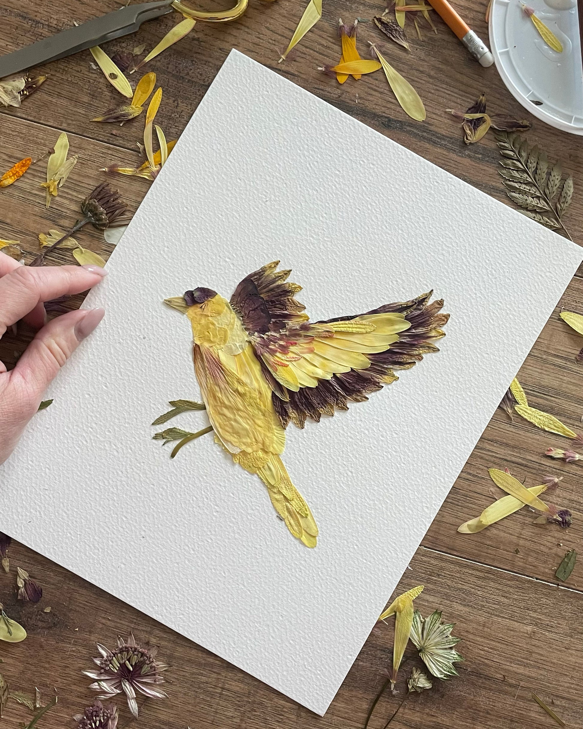 A sign of joy, optimism, and new beginnings, the yellow finch brings movement and energy to this floral composition. Crafted with vibrant sunflower, peony, pansy, and gerbera daisy petals, this piece embodies the essence of spring renewal.