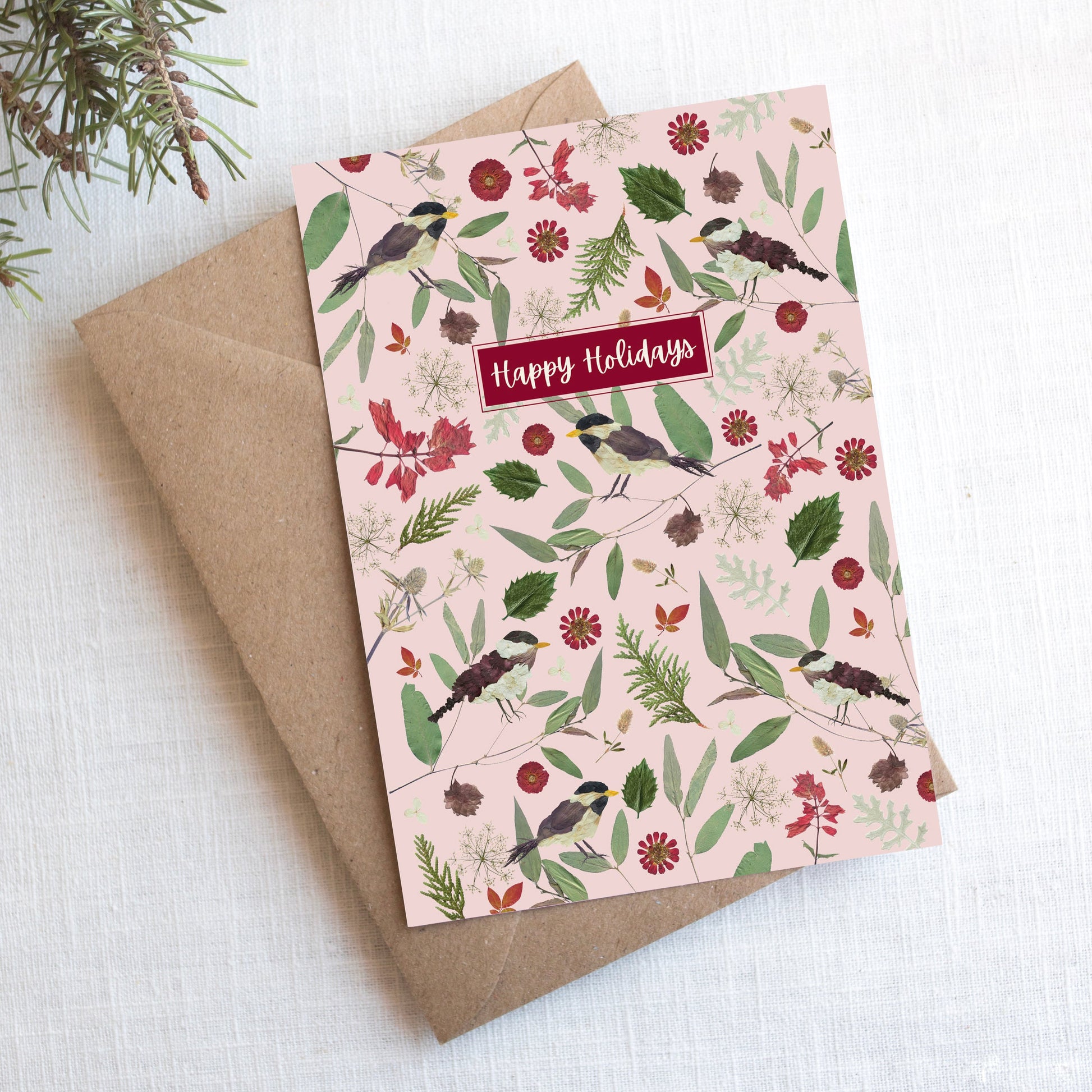Cute Chickadee pattern with seasonal pressed florals and leaves "Happy Holidays" greeting card.