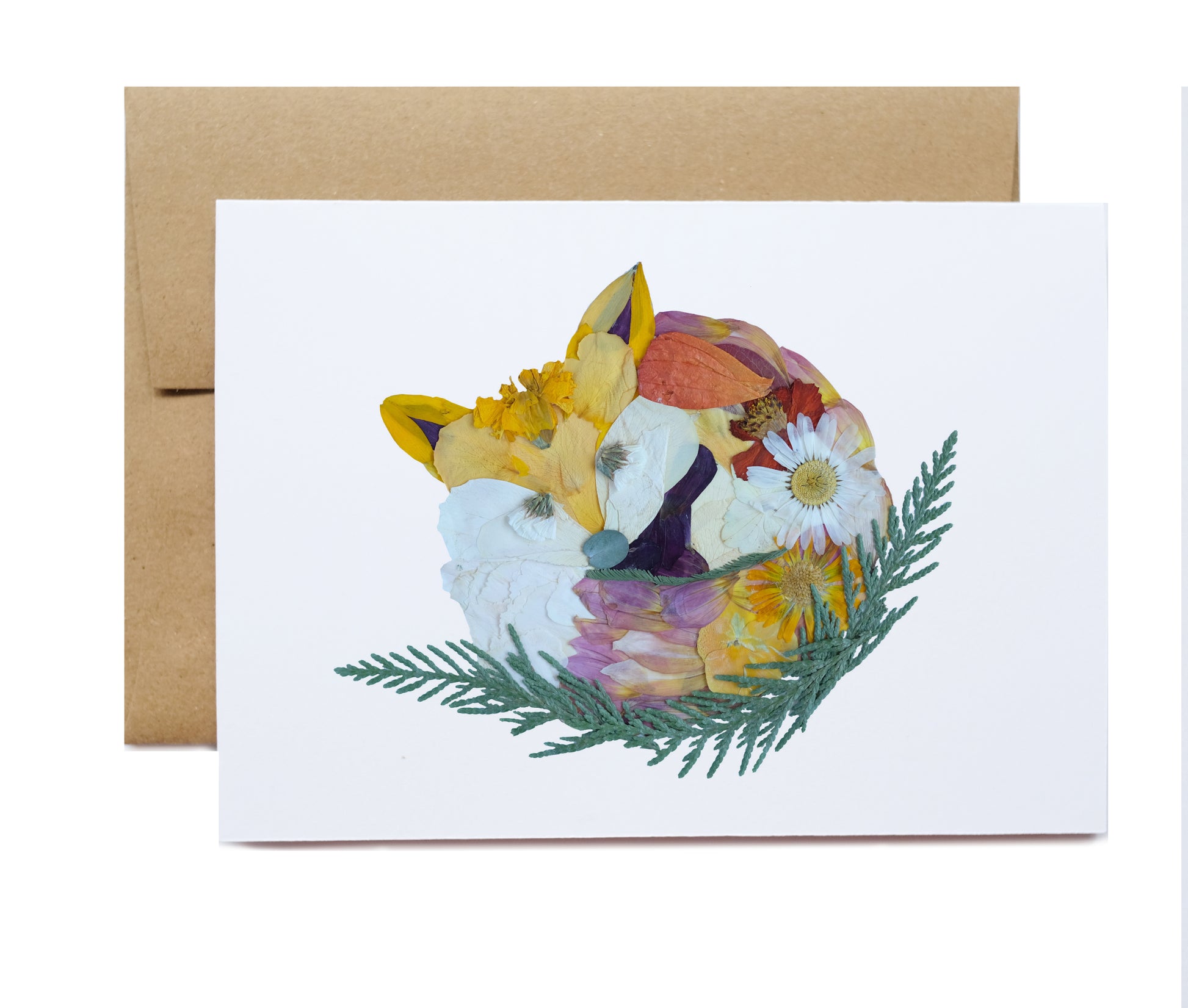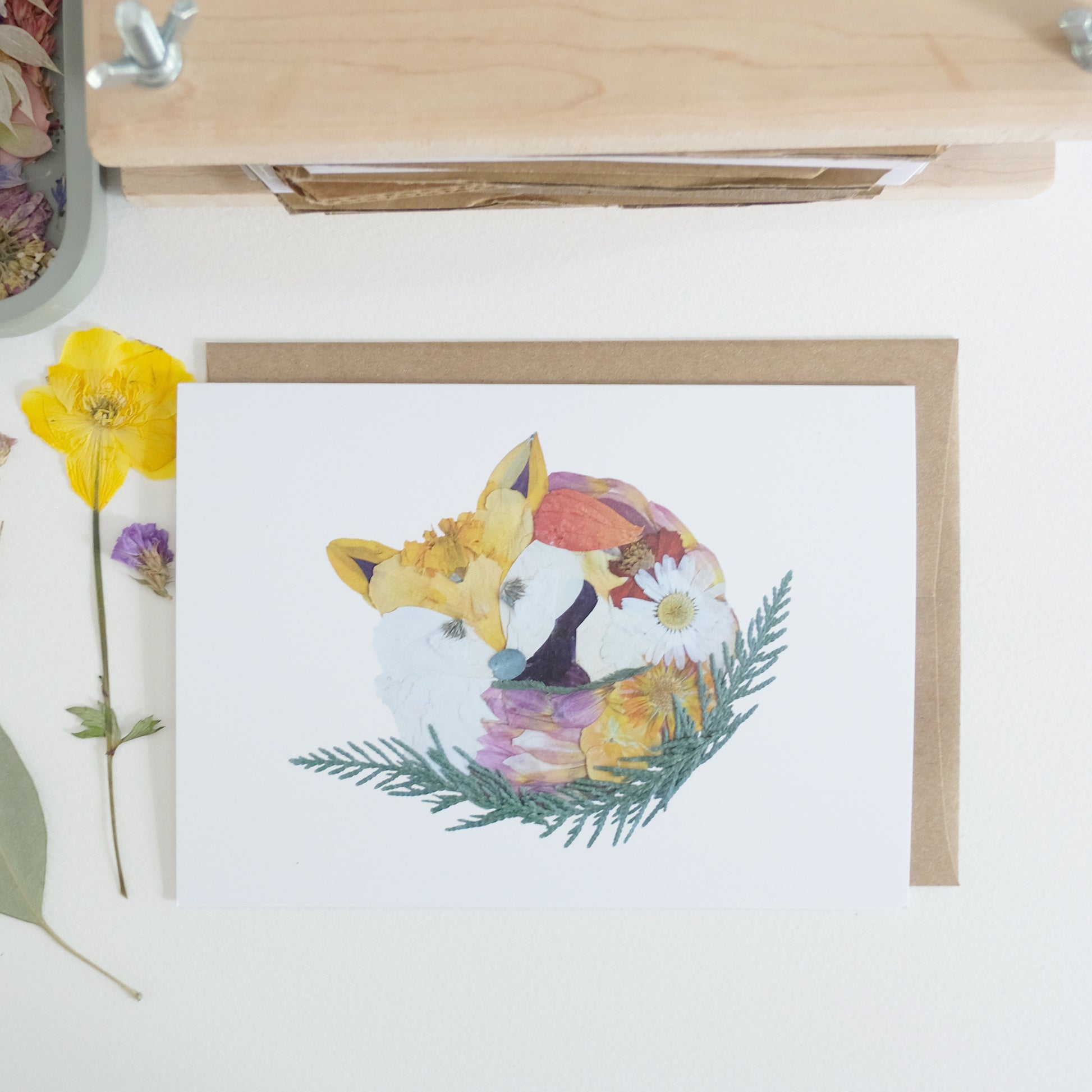 Cute sleeping fox greeting card, artwork made with pressed flowers, blank for any occasion from a get-well soon to a welcome baby.