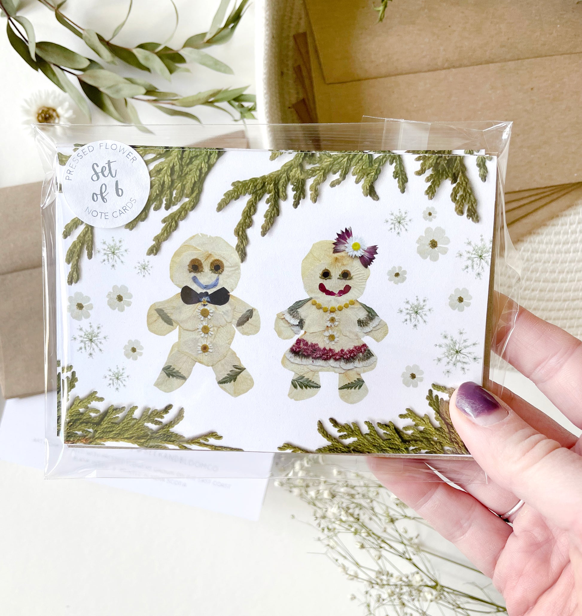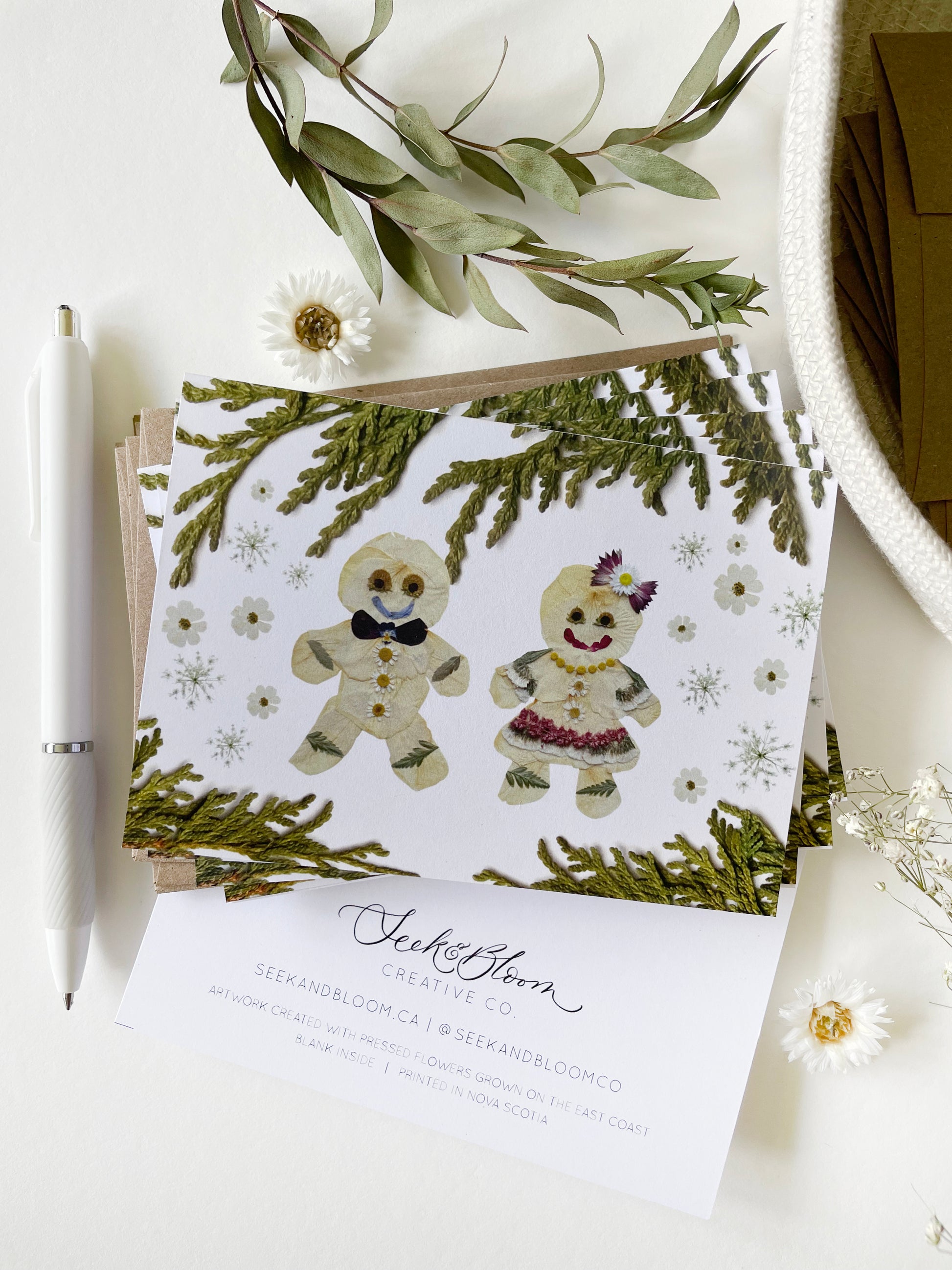 Pressed Flower Gingerbread Friends, Blank Holiday Note Card Set