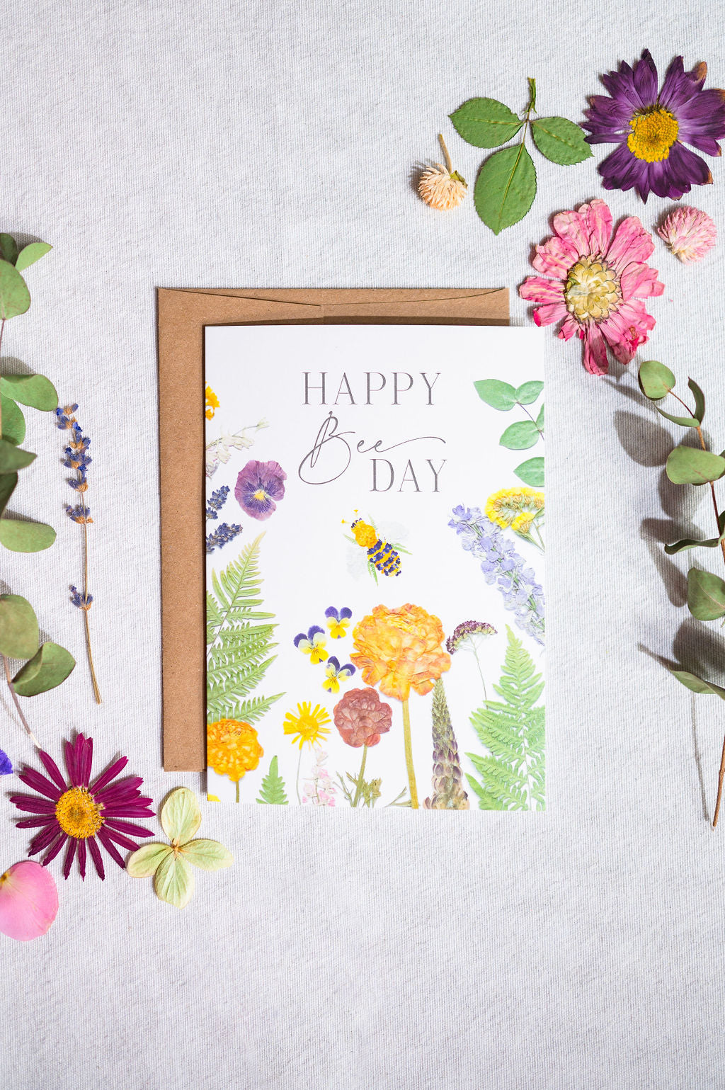 Happy BEE Day, Happy Birthday, Garden, Digitally Printed, Pressed Flower Design