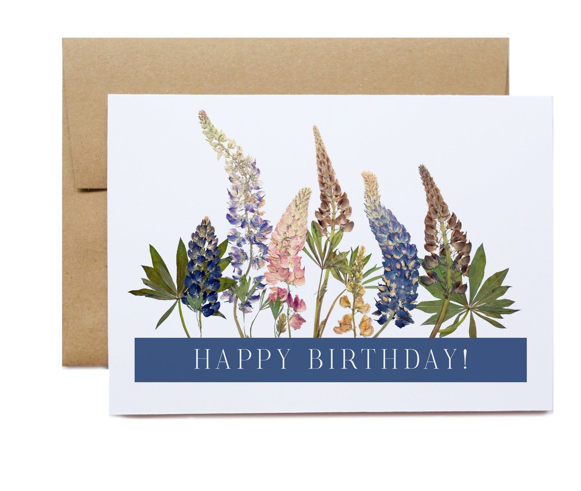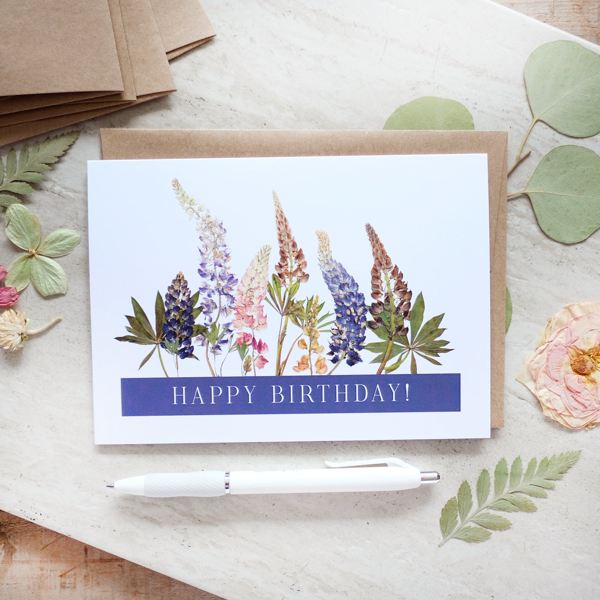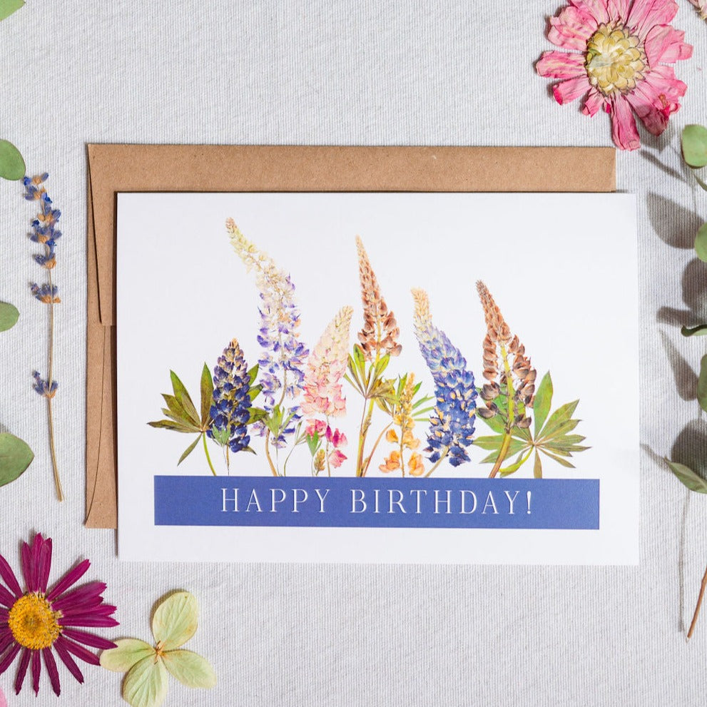 Happy Birthday, Lupin, Wild Lupins, Garden, Digitally Printed, Pressed Flower Design