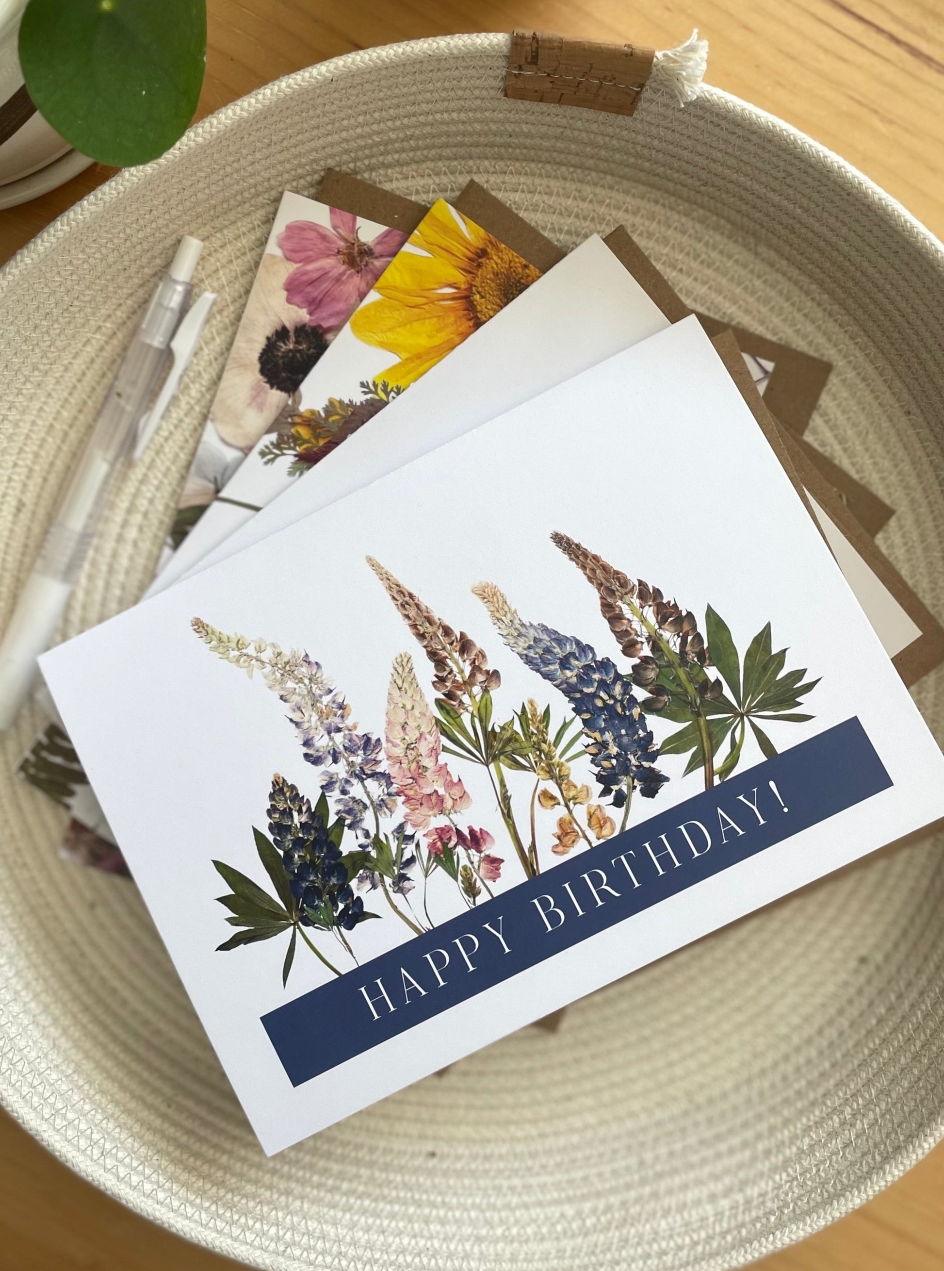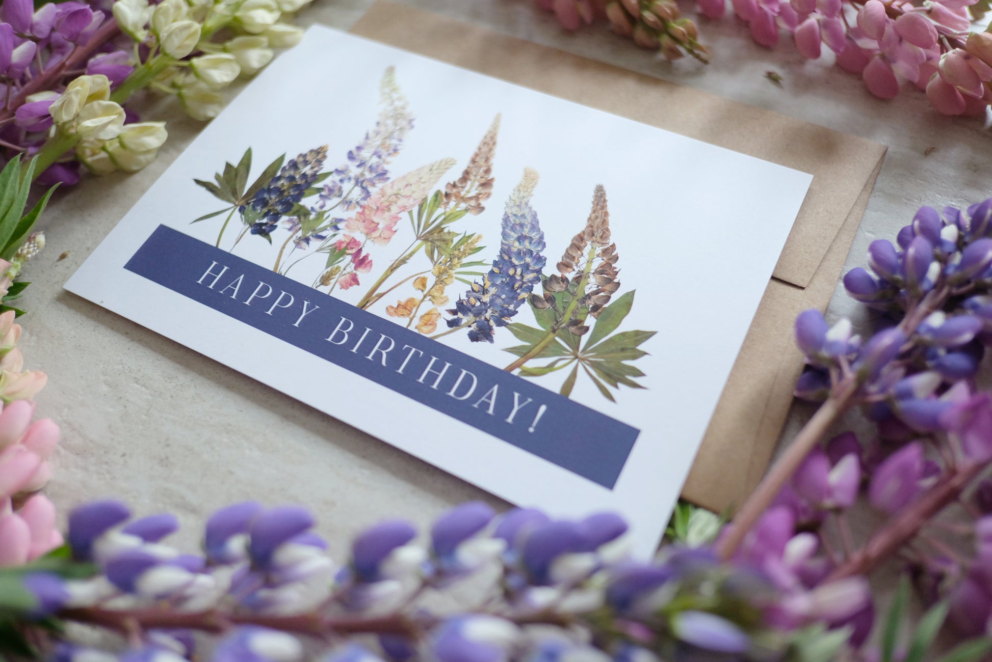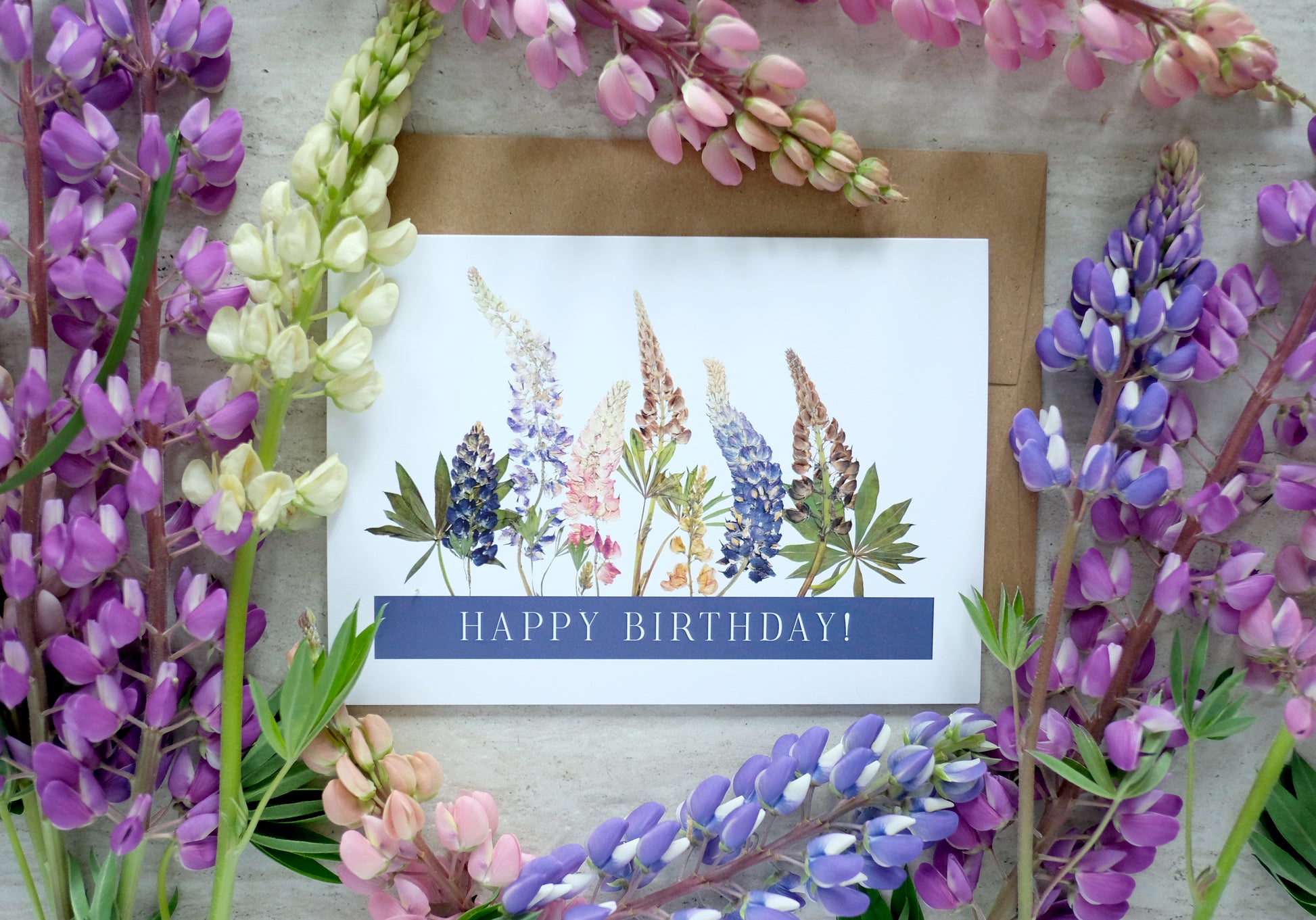 Happy Birthday, Lupin, Wild Lupins, Garden, Digitally Printed, Pressed Flower Design