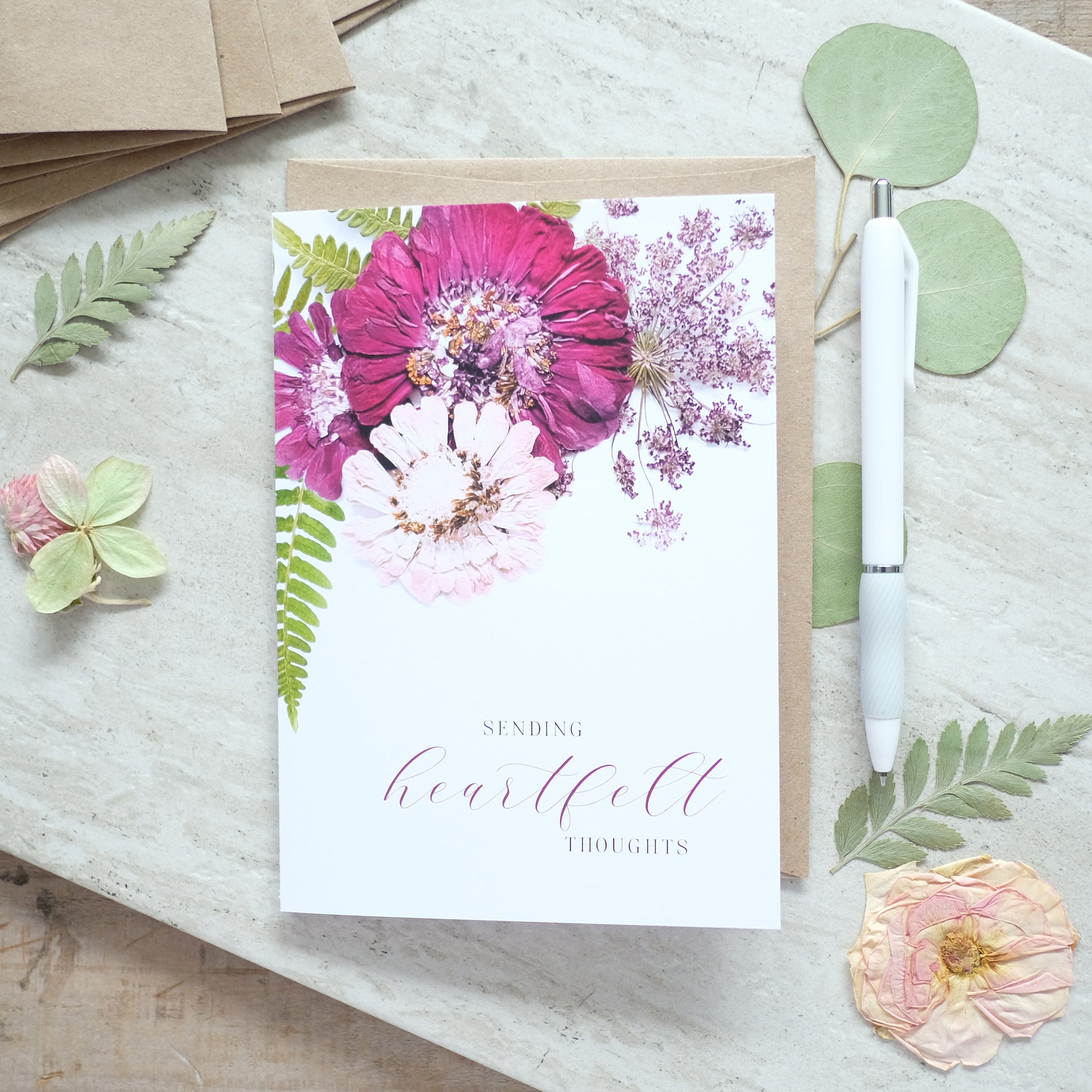 Sending Heartfelt Thoughts, Sympathy, Grief, Printed Pressed Flower Card