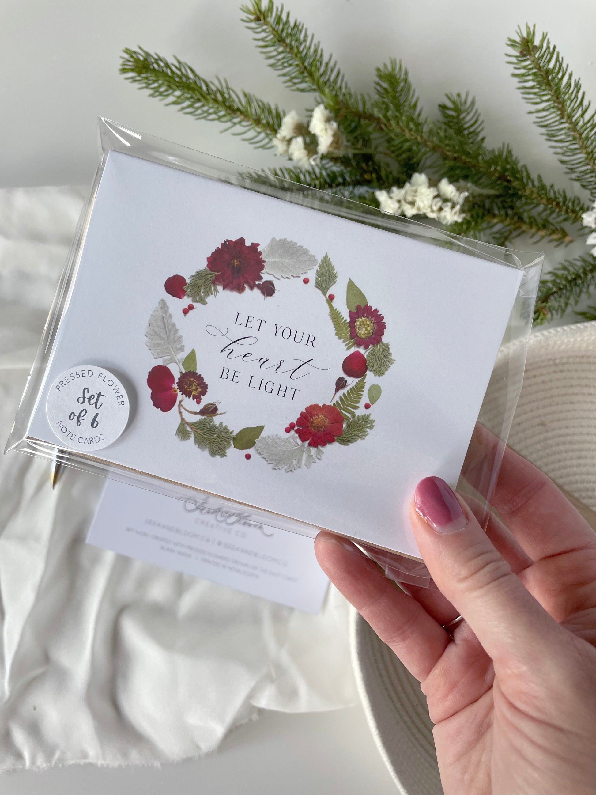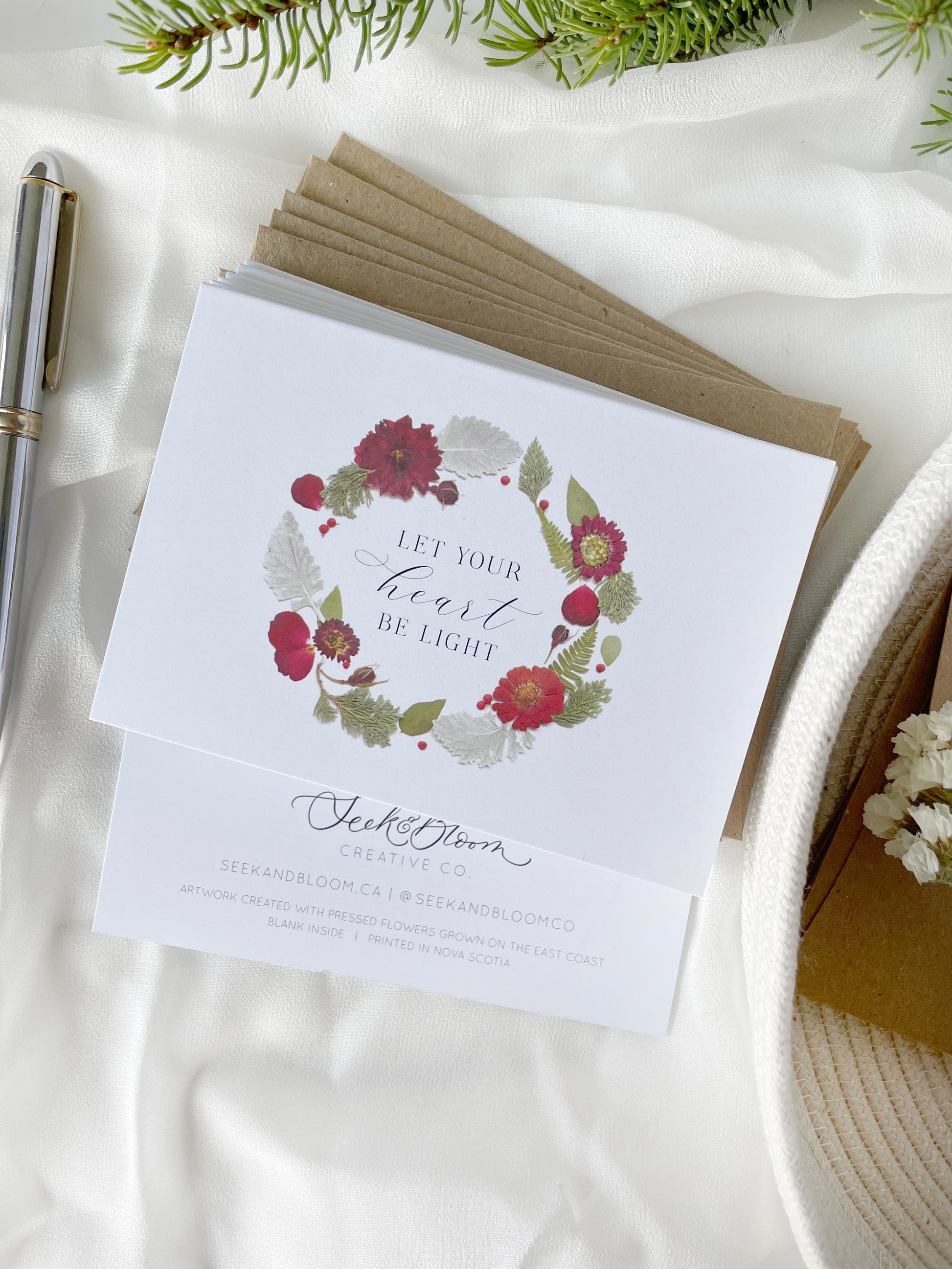 Pressed Flower Wreath, Let Your Heart Be Light, Seasonal Note Card Set