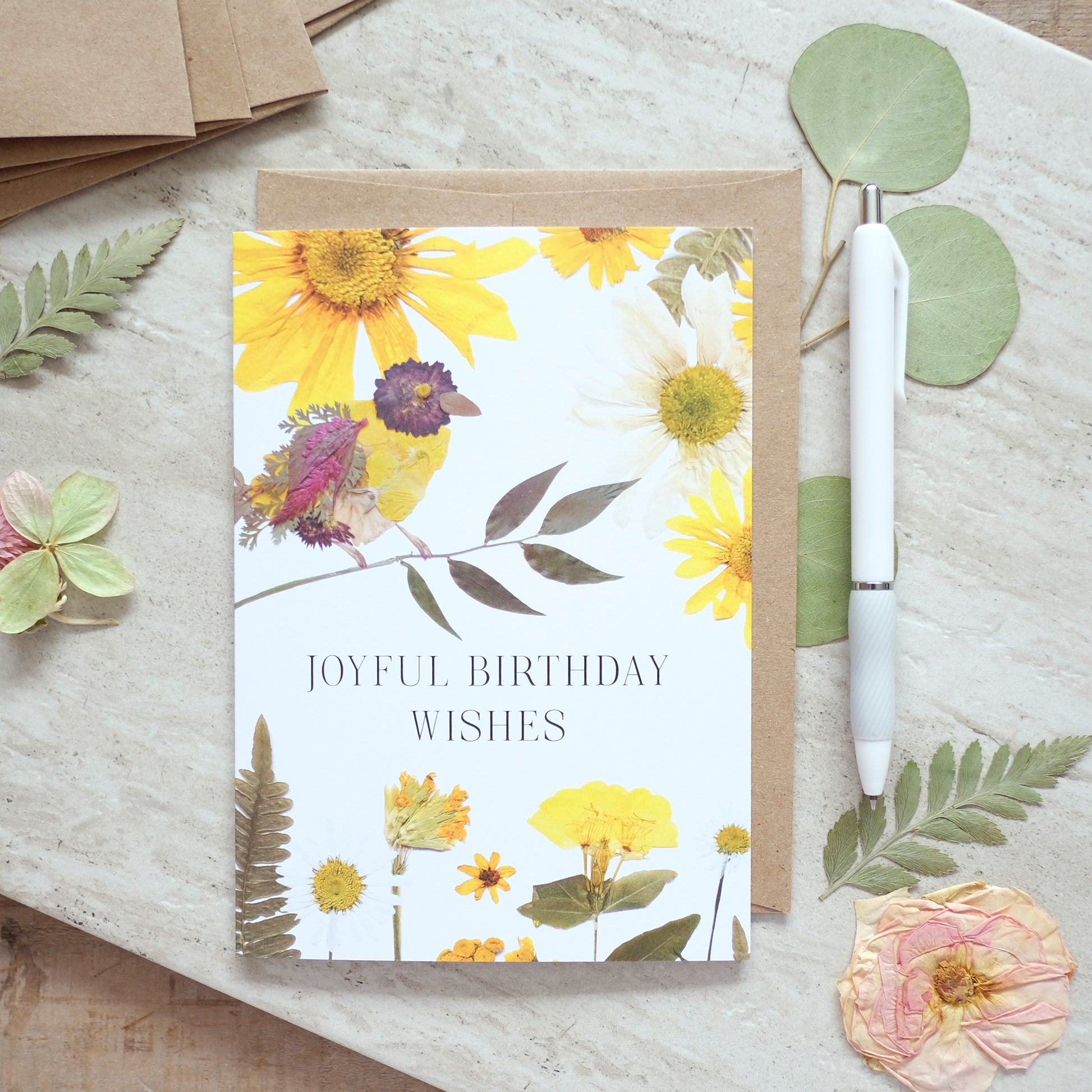 Joyful Birthday Wishes pressed flowers with bird, Digitally Printed, Pressed Flower Design