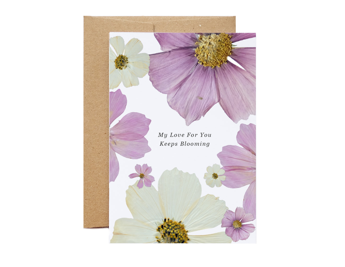 Pink and white Cosmo flowers, My Love For You Keeps Blooming, Pressed Flower Valentine's Day Greeting Card.