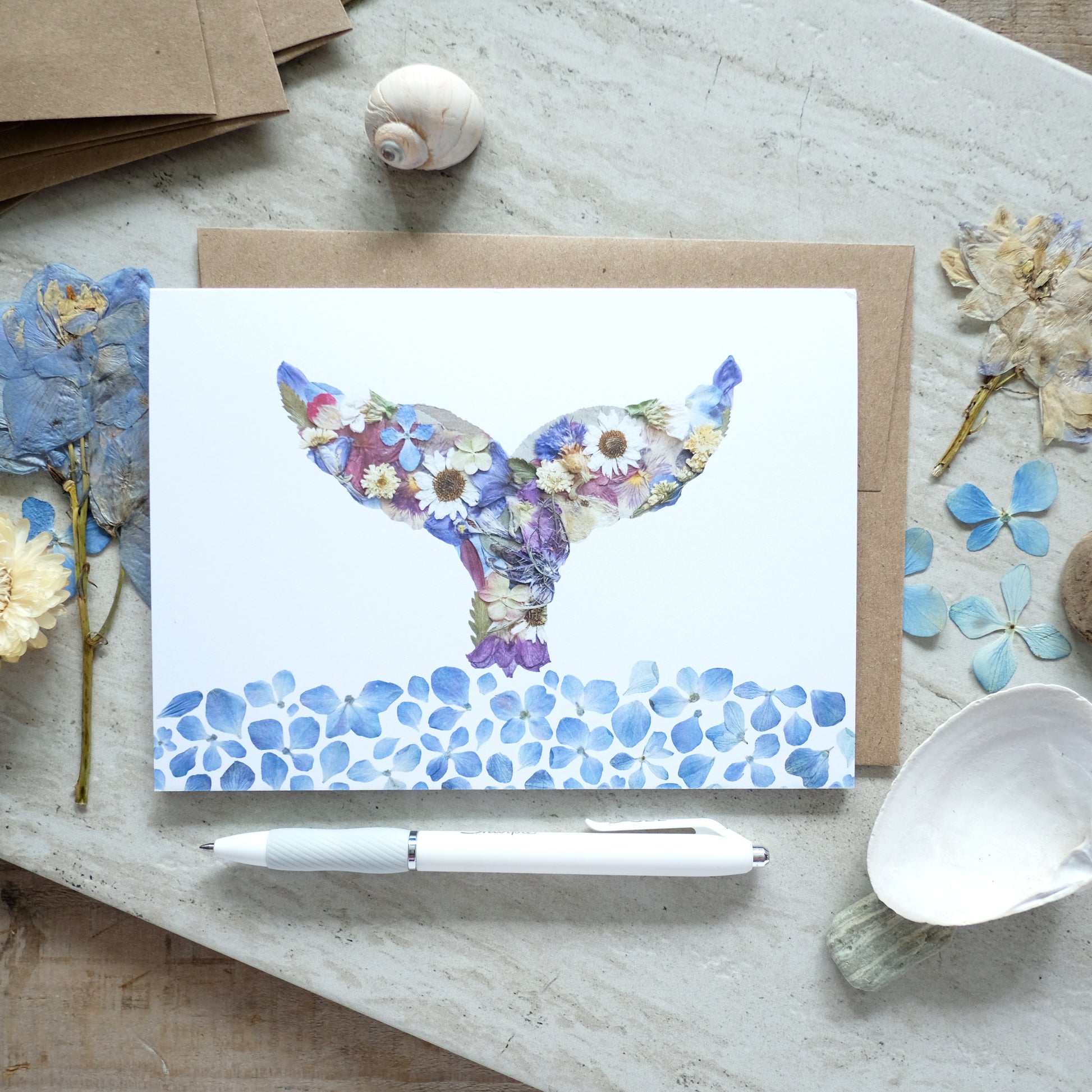 Pressed flower whale tail in the ocean, everyday blank greeting card perfect for any occasion.