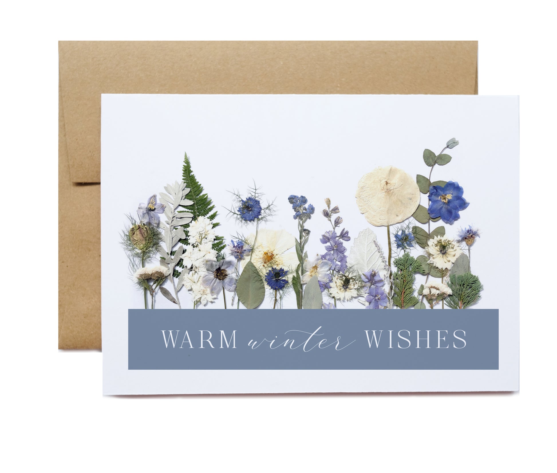 Holiday Card, Blue and white, Warm Winter Wishes, Pressed flower Card