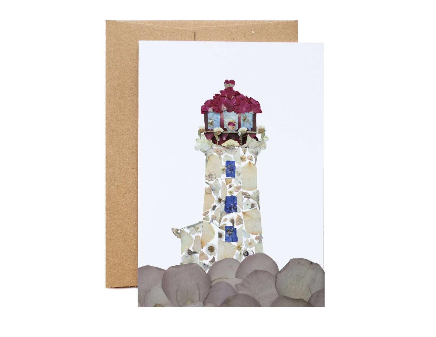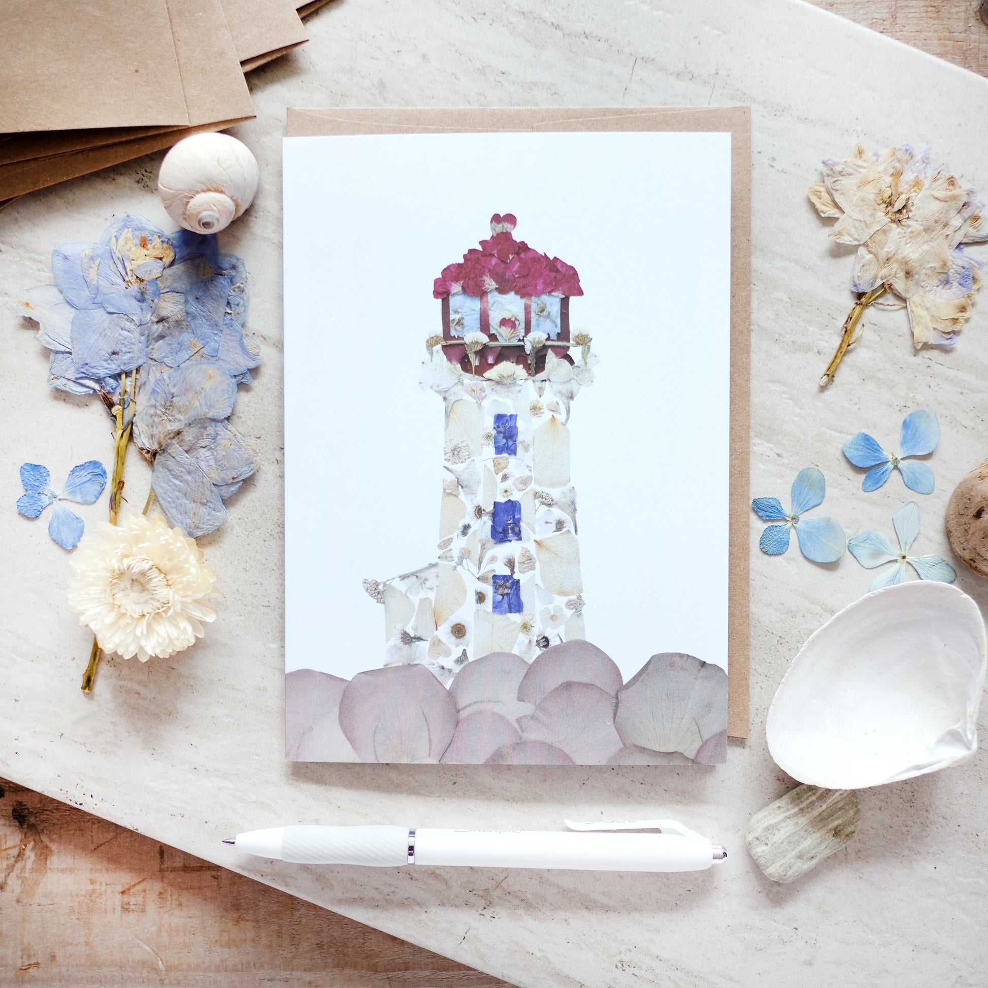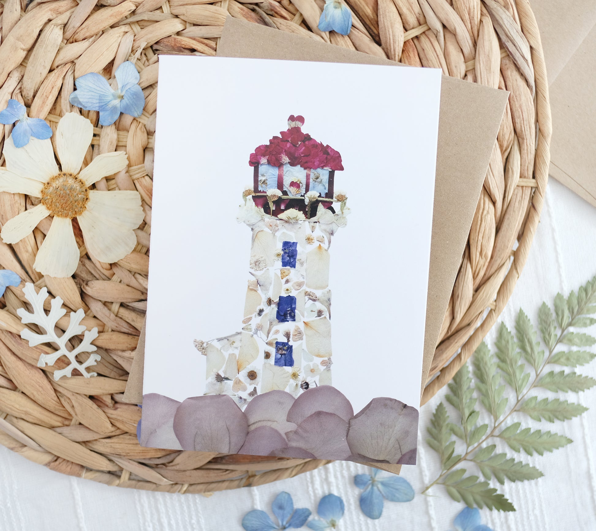 Pressed flower artwork of Peggy's Cove Lighthouse, Nova Scotia themed greeting card blank card design for everyday greetings or special occasions.