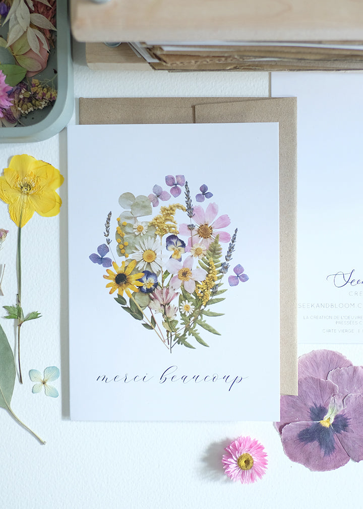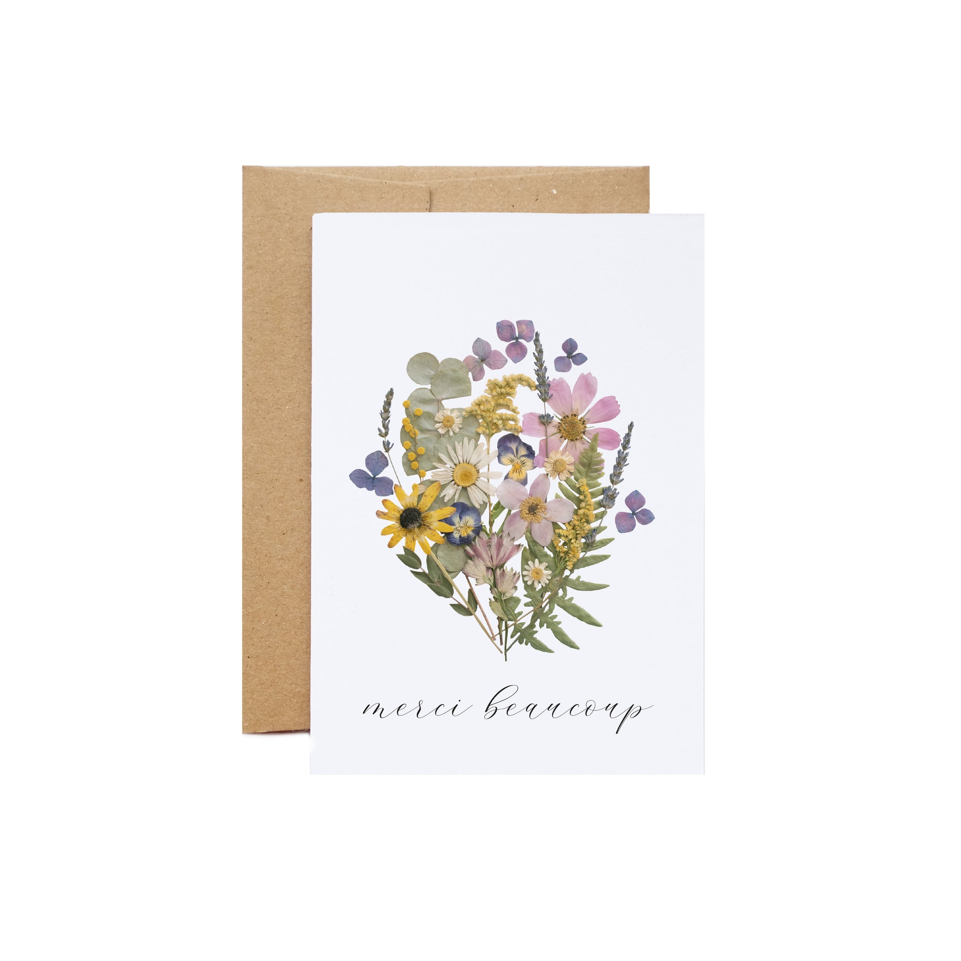 Merci Beaucoup gratitude card with pressed bouquet, artwork designed with pressed flowers.