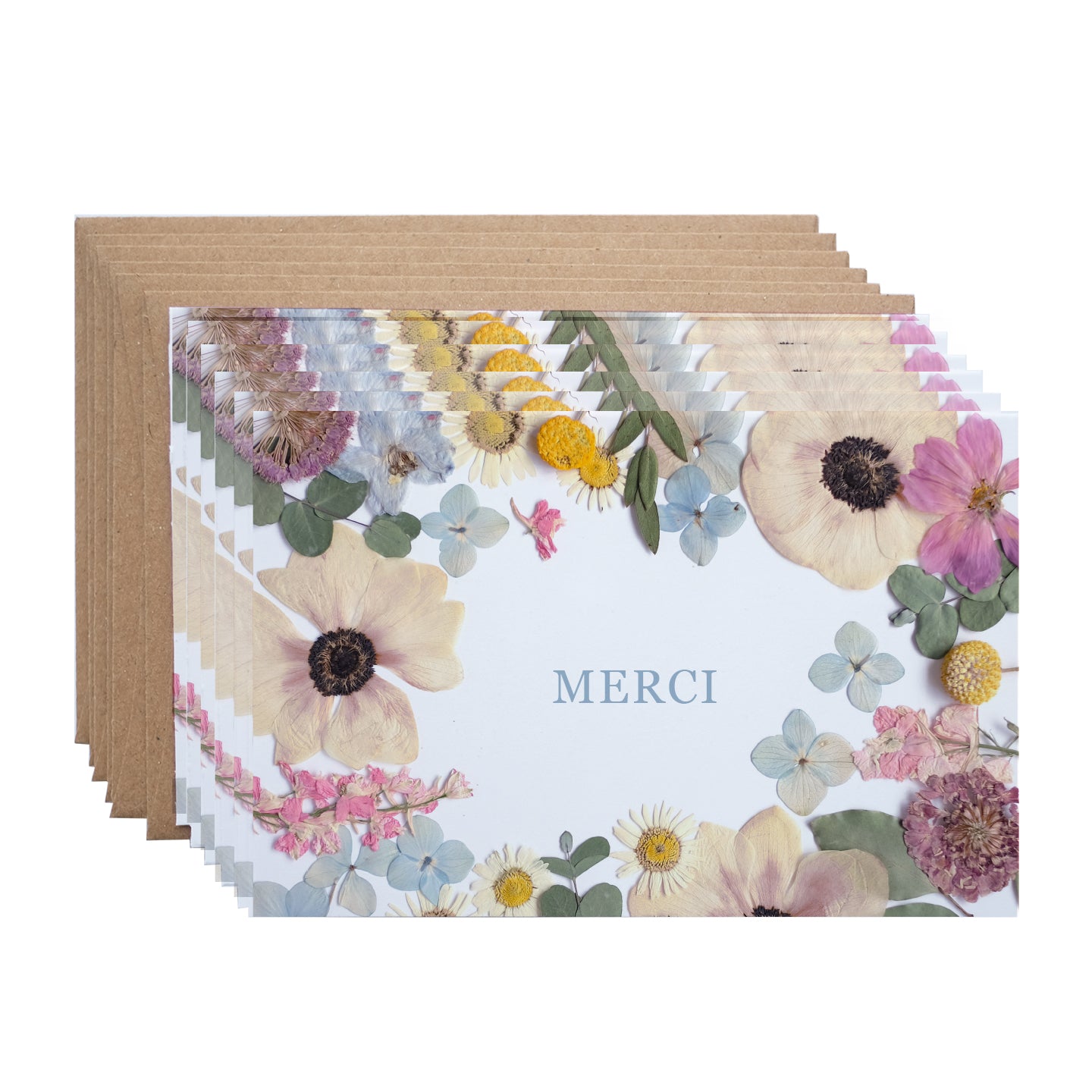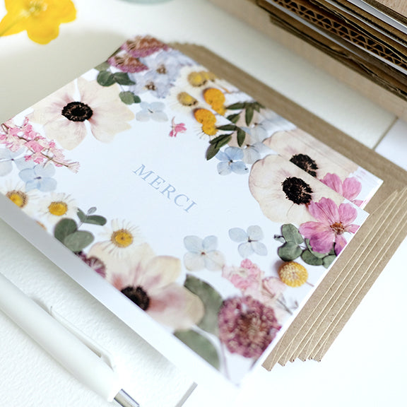Enjoy writing thank you's with our beloved "MERCI" Pressed Flower Note Card Set. Featuring soft and elegant anemones, blue hydrangeas, and daisies, this customer favourite is great to have on hand. Perfect for expressing heartfelt appreciation, let these beautiful cards convey your gratitude with sophistication and grace, making every recipient feel truly appreciated and valued.