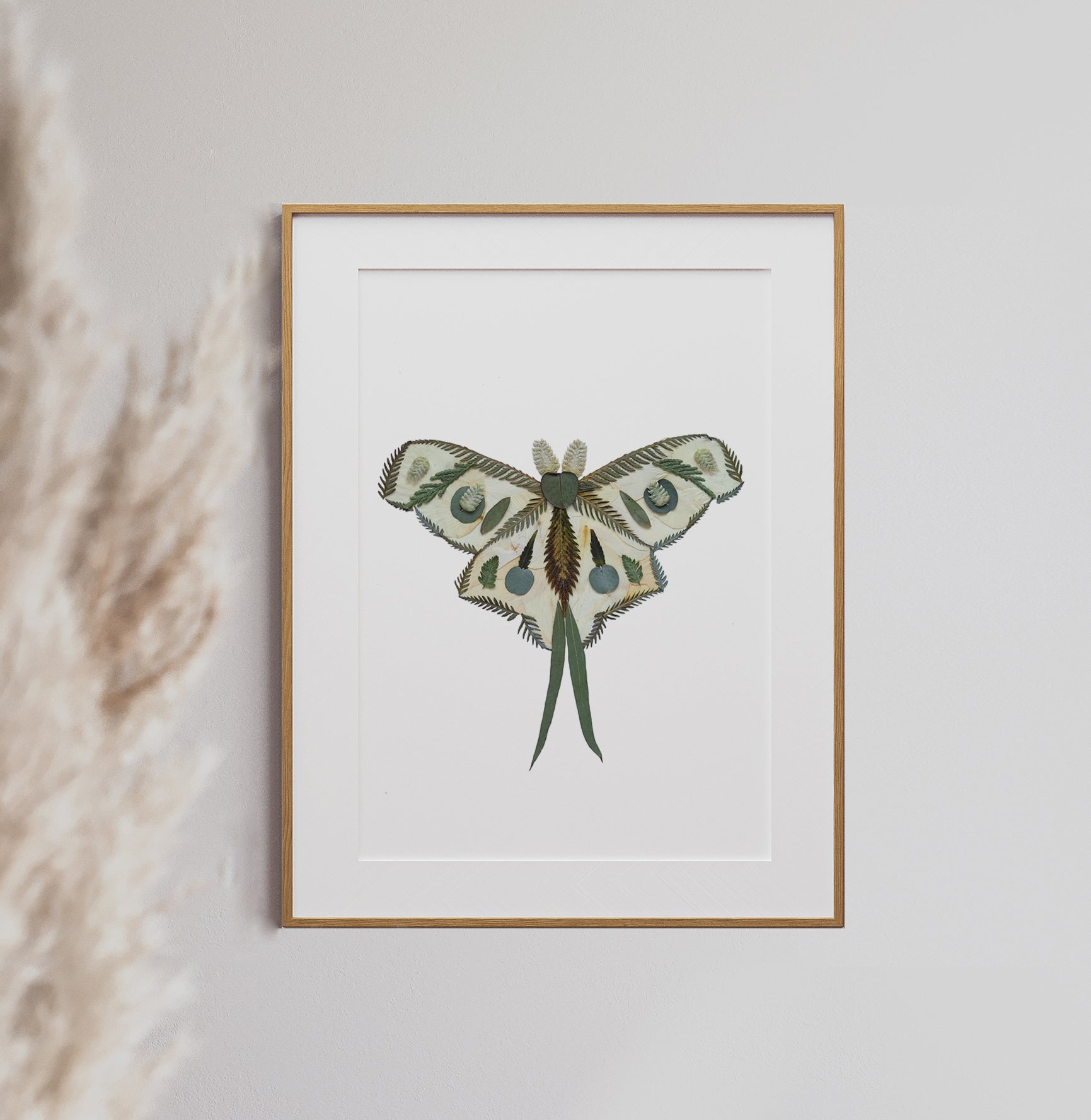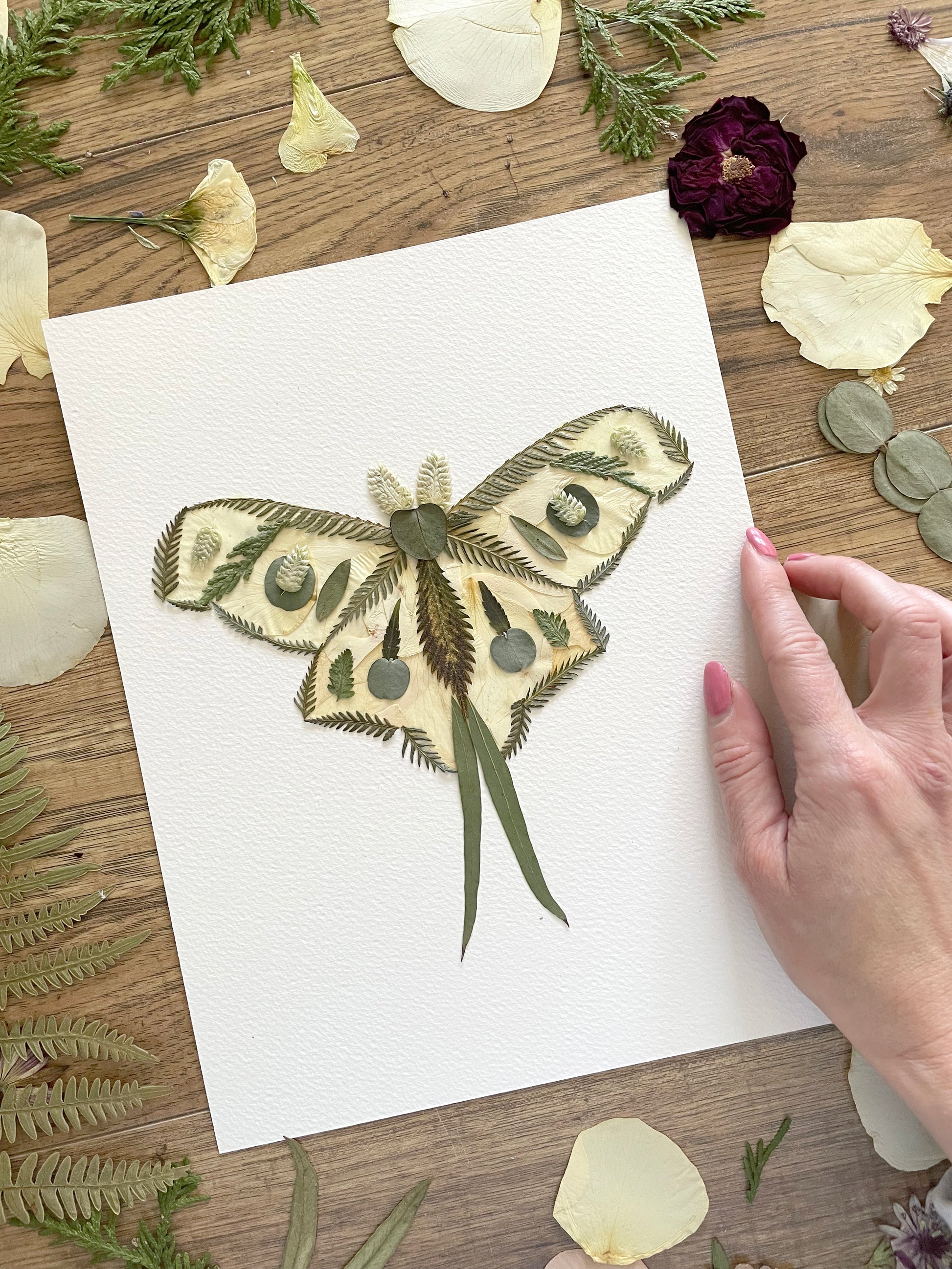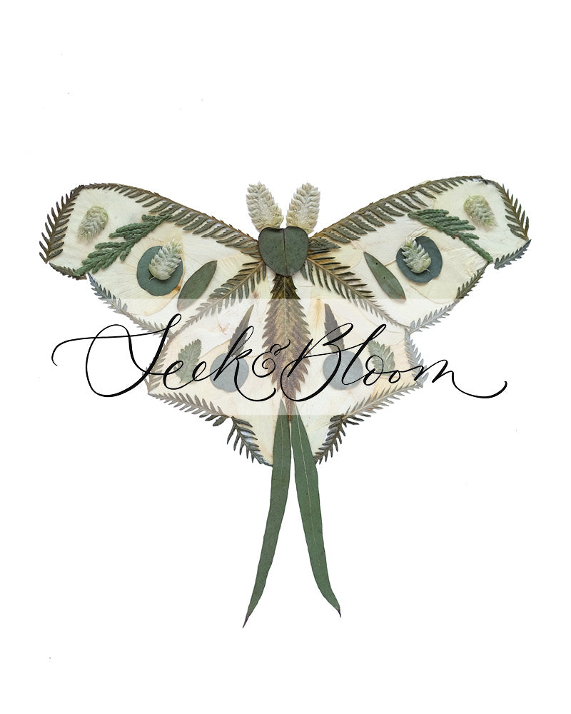 Pressed Flower Luna Moth art made with green foliage and white rose petals.