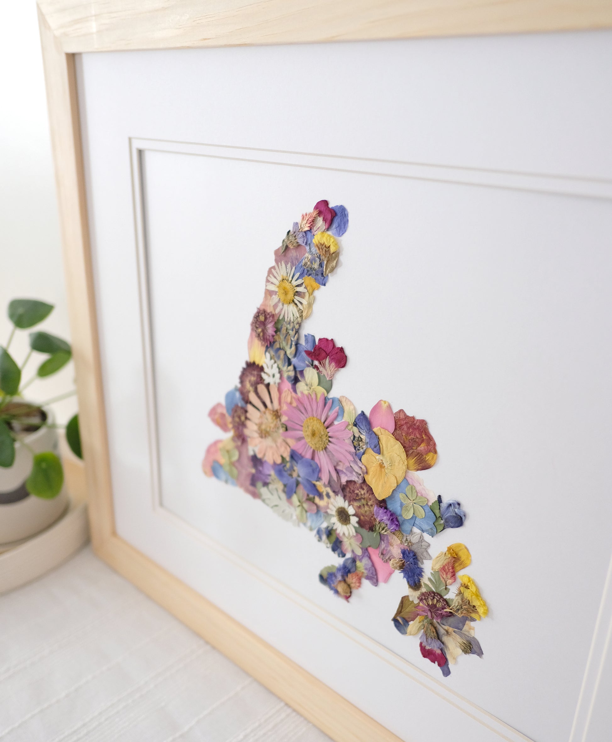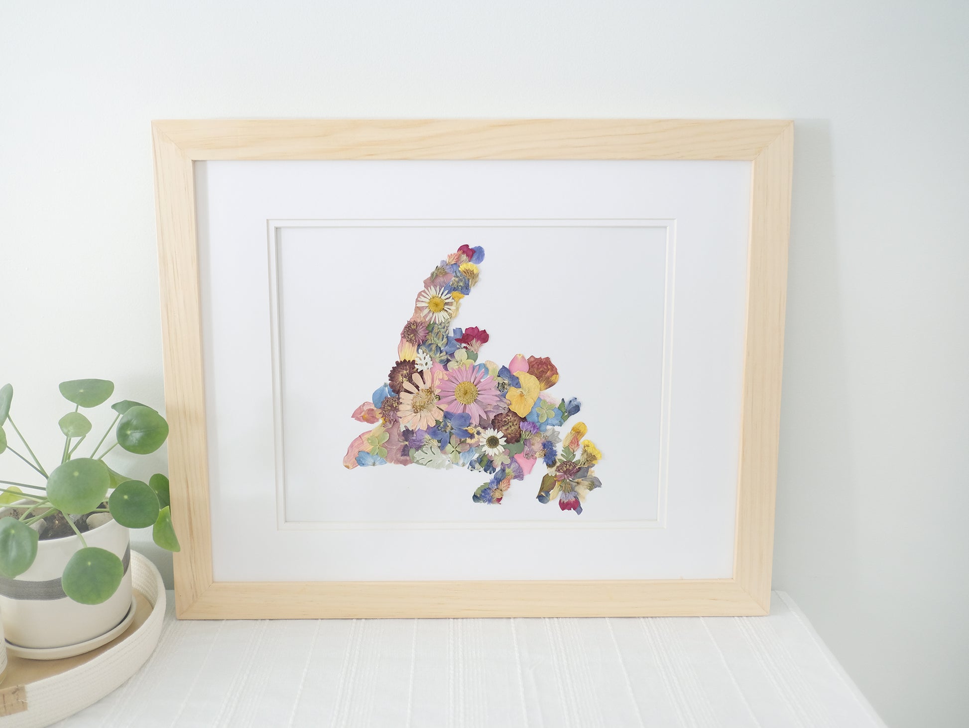 Framed Pressed Flower Newfoundland Map, Original artwork, and real flowers and greenery. Comes framed and ready to hang!