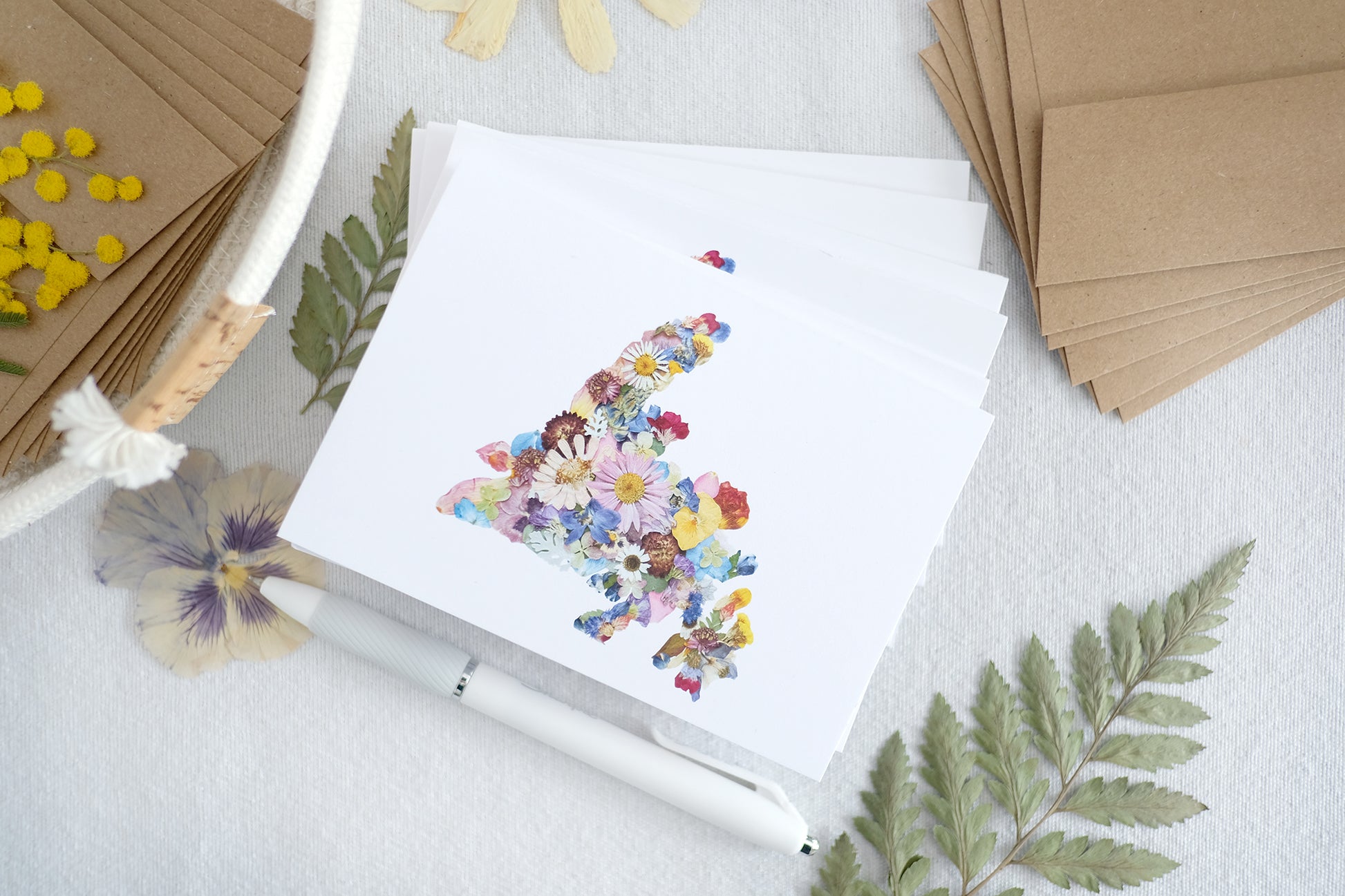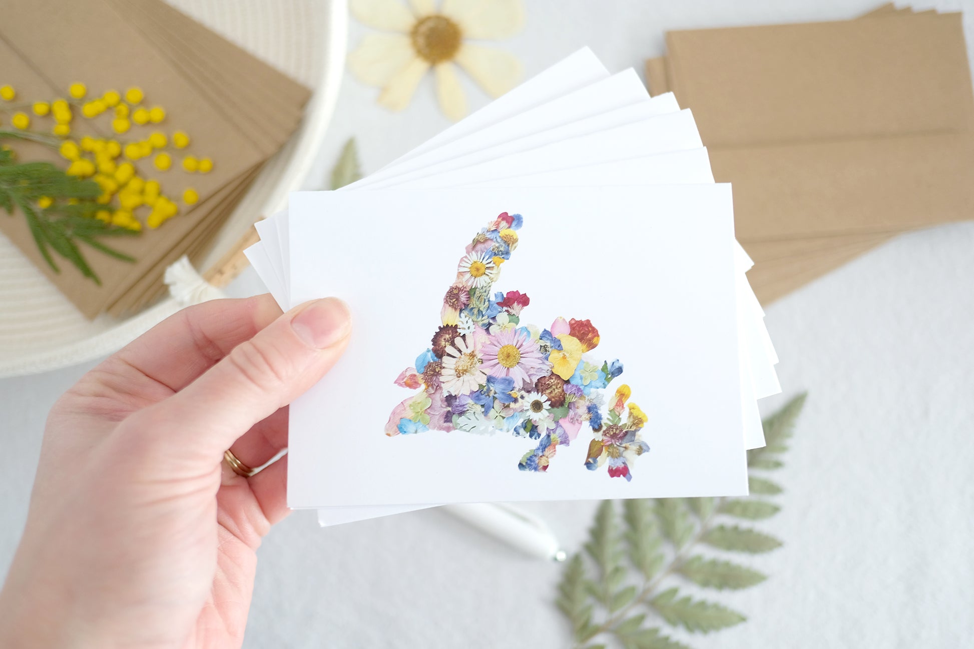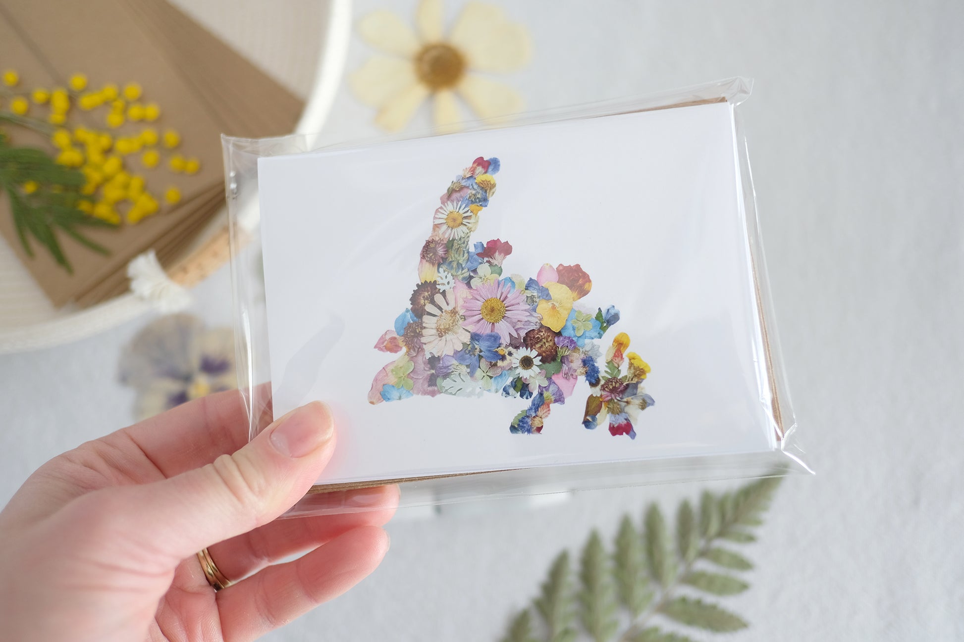 Discover the blooms of Newfoundland with our pressed flower map note card set, perfect for sending heartfelt greetings or reminiscing about cherished moments. These cards offer a heartfelt connection to the beauty of the East Coast, where our vibrant pressed flowers are lovingly foraged and pressed.