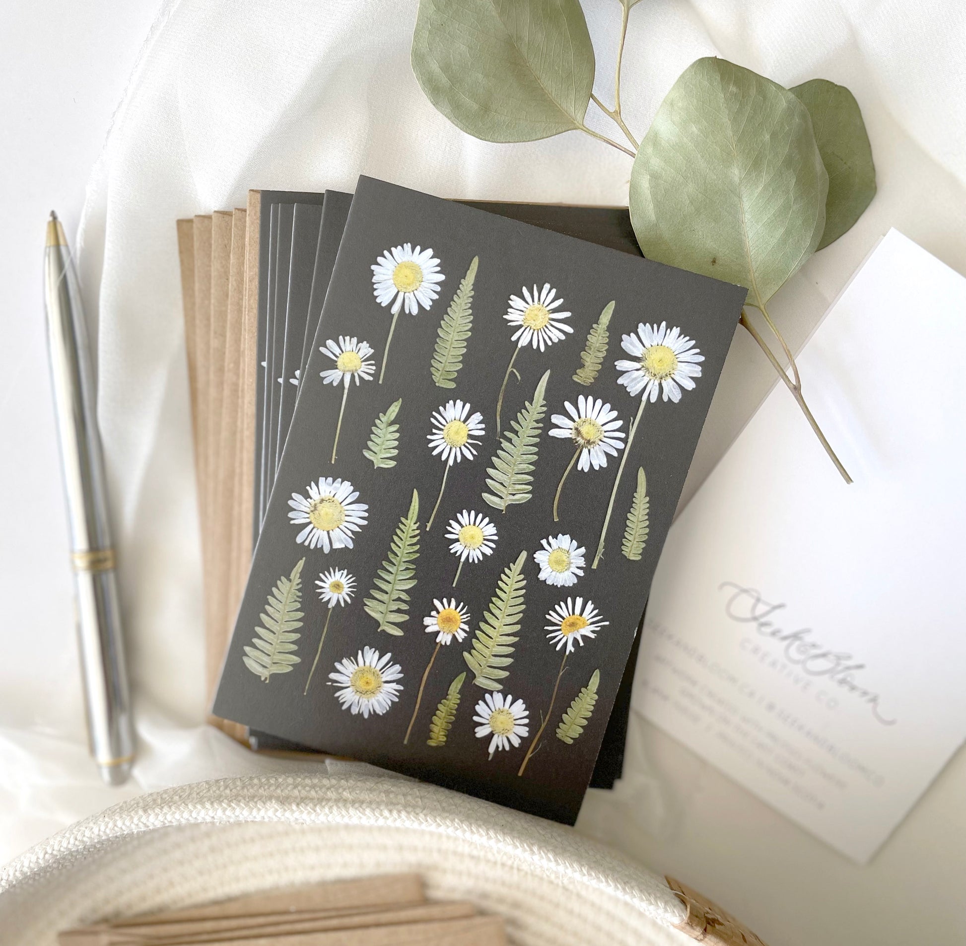 Enjoy the joy of nature in the spring and summer with our popular Wild Daisy and Fern Note Card Set. Cards feature artwork from original pressed wild daisies and ferns against a striking black background, creating a contrasting sophisticated look.