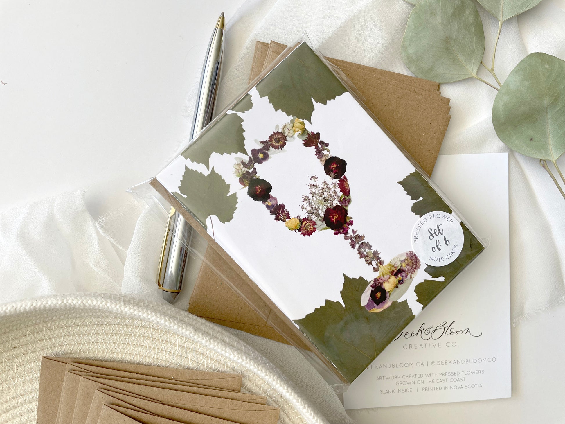 Floral Wine Glass Note Card Set. Crafted from pressed flowers and grapevine leaves, each card features an artistic floral wine glass artwork. Inspired by the wineries of the Annapolis Valley, this set captures the region's natural beauty and winemaking heritage. Perfect for wine enthusiasts, party favour or as a unique souvenir, these cards offer a special touch of local flair to any occasion.