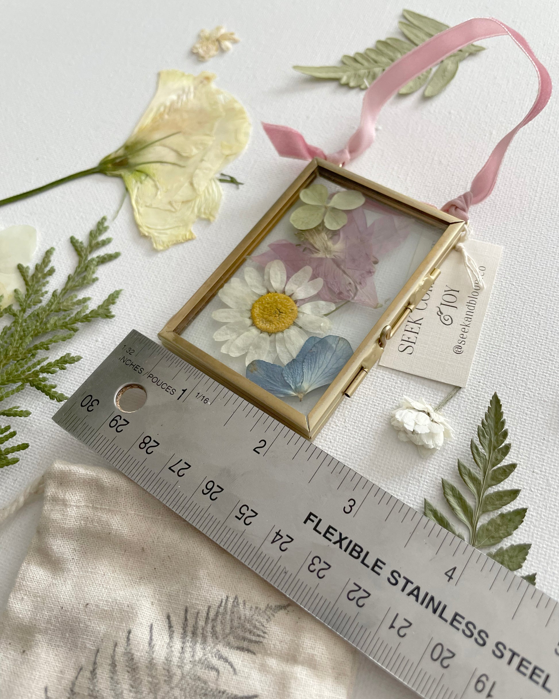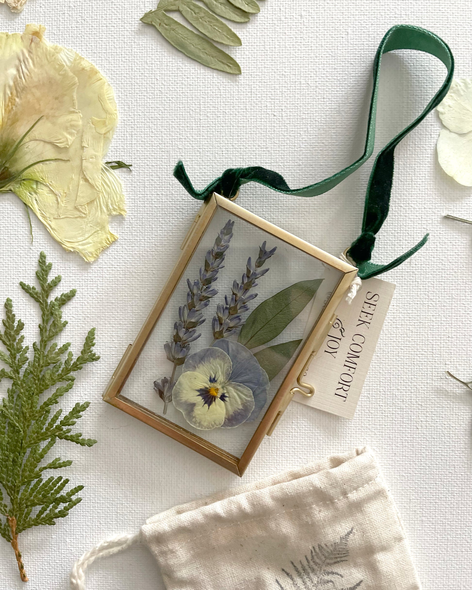 Each ornament features locally grown & hand pressed flowers & is one of a kind.
