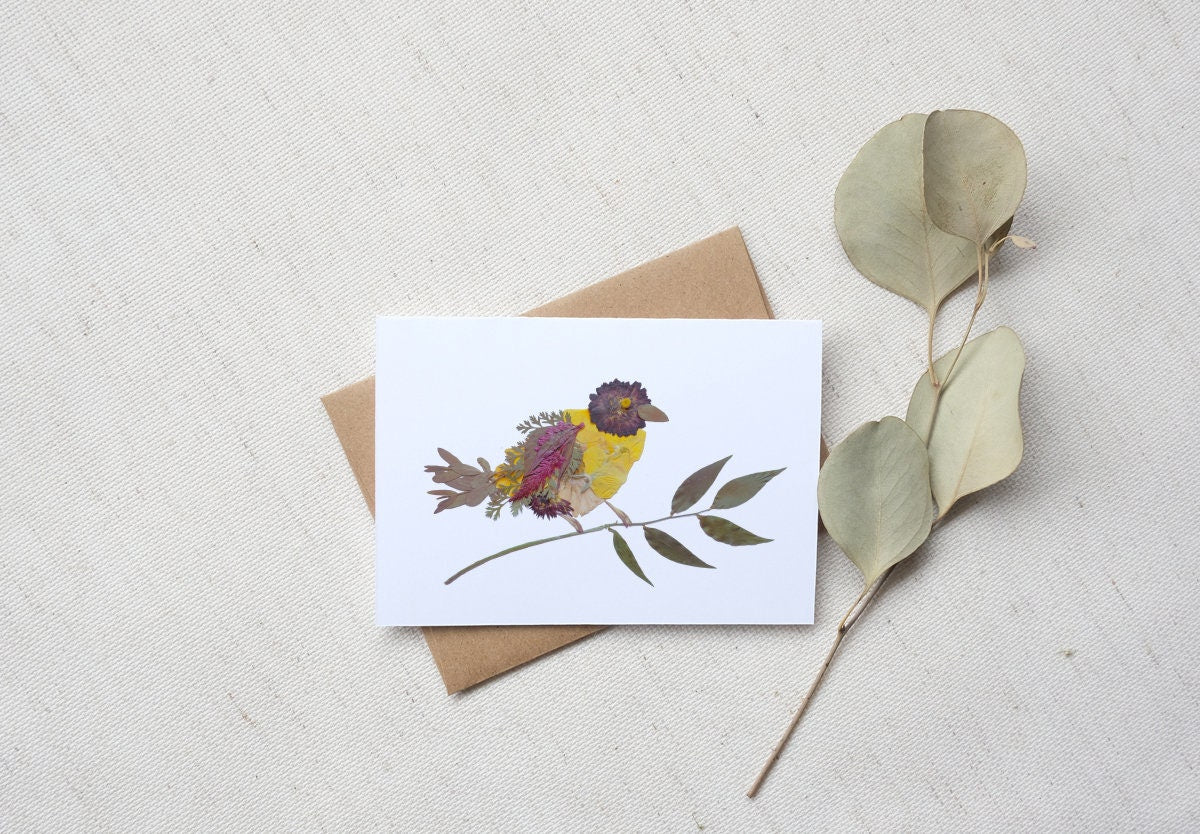 Embrace the beauty of nature with our Yellow Bird Note Card! The bird artwork was originally handcrafted from pressed flowers and greenery, each card features our delightful yellow bird design, adding a touch of joy to your messages.