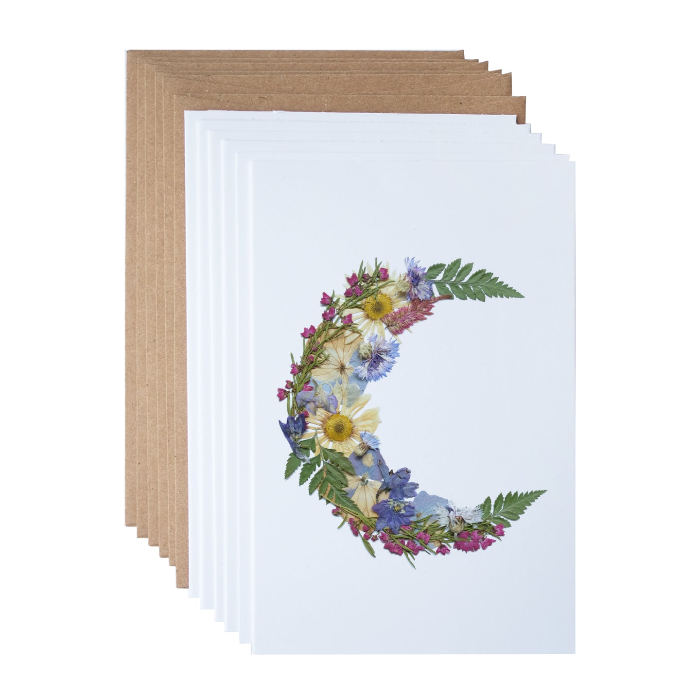 Crescent Moon Pressed Flower Note Cards. Discover the beautiful connection between the moon and Earth. This set features a serene crescent moon crafted from pressed flowers, symbolizing love, and hope. Extend heartfelt sentiments with these cards, inviting the recipient to embrace the magic of the moon and the ever-changing beauty of blooming flowers.