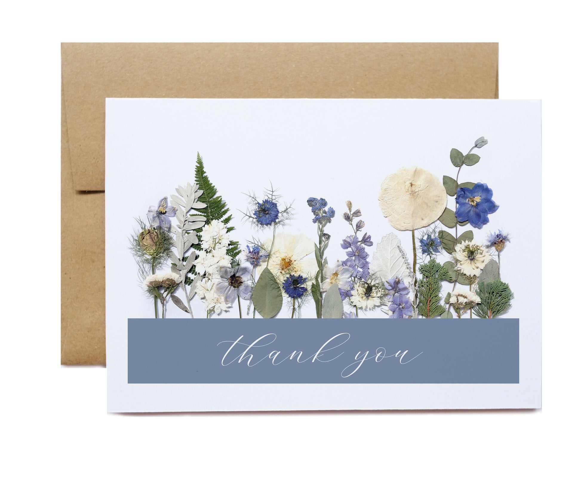 Soft Blue Natural Flower Garden Thank You Card Set. Each card features a calming blue floral design, and radiates gratitude and warmth. Perfect for expressing heartfelt thanks, let these cards convey your appreciation with simplicity and sincerity.