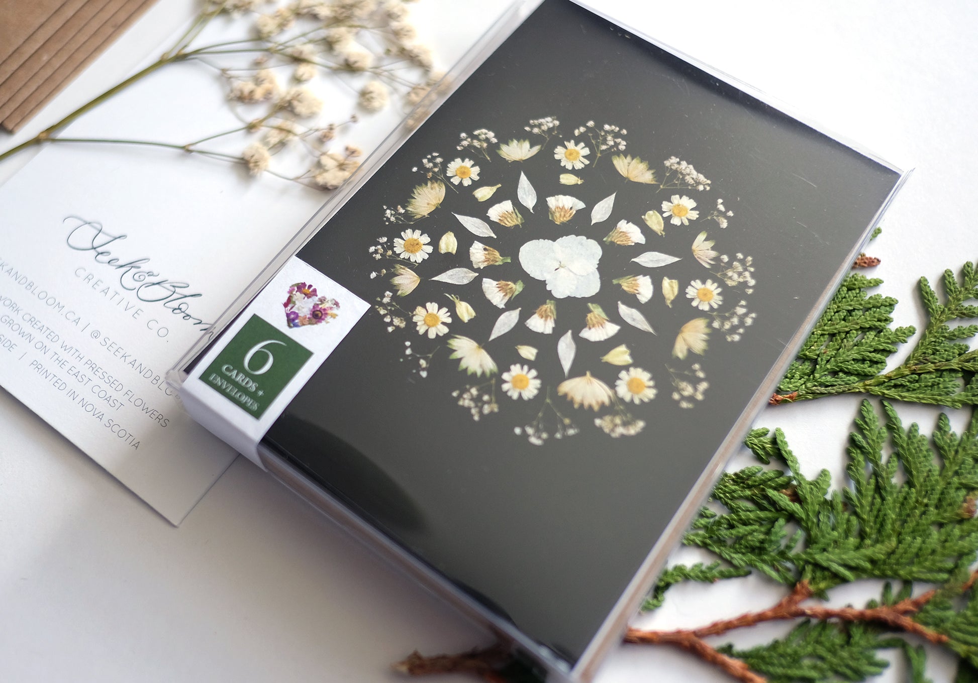 Pressed Flower, Snowflake Mandala design with black background Note Card Set