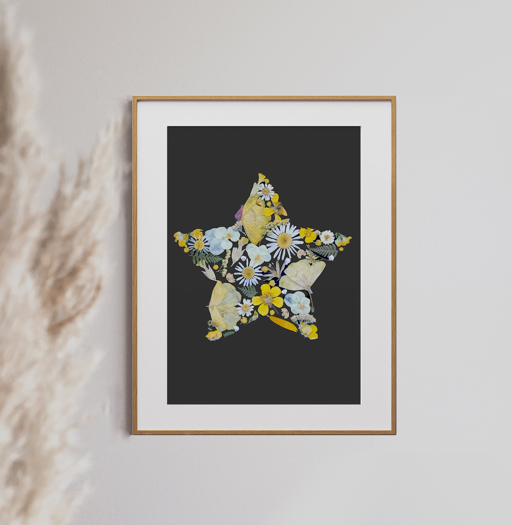 Pressed Flower Star art is designed with yellow and white flowers with a black background.