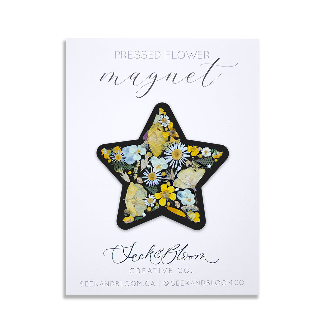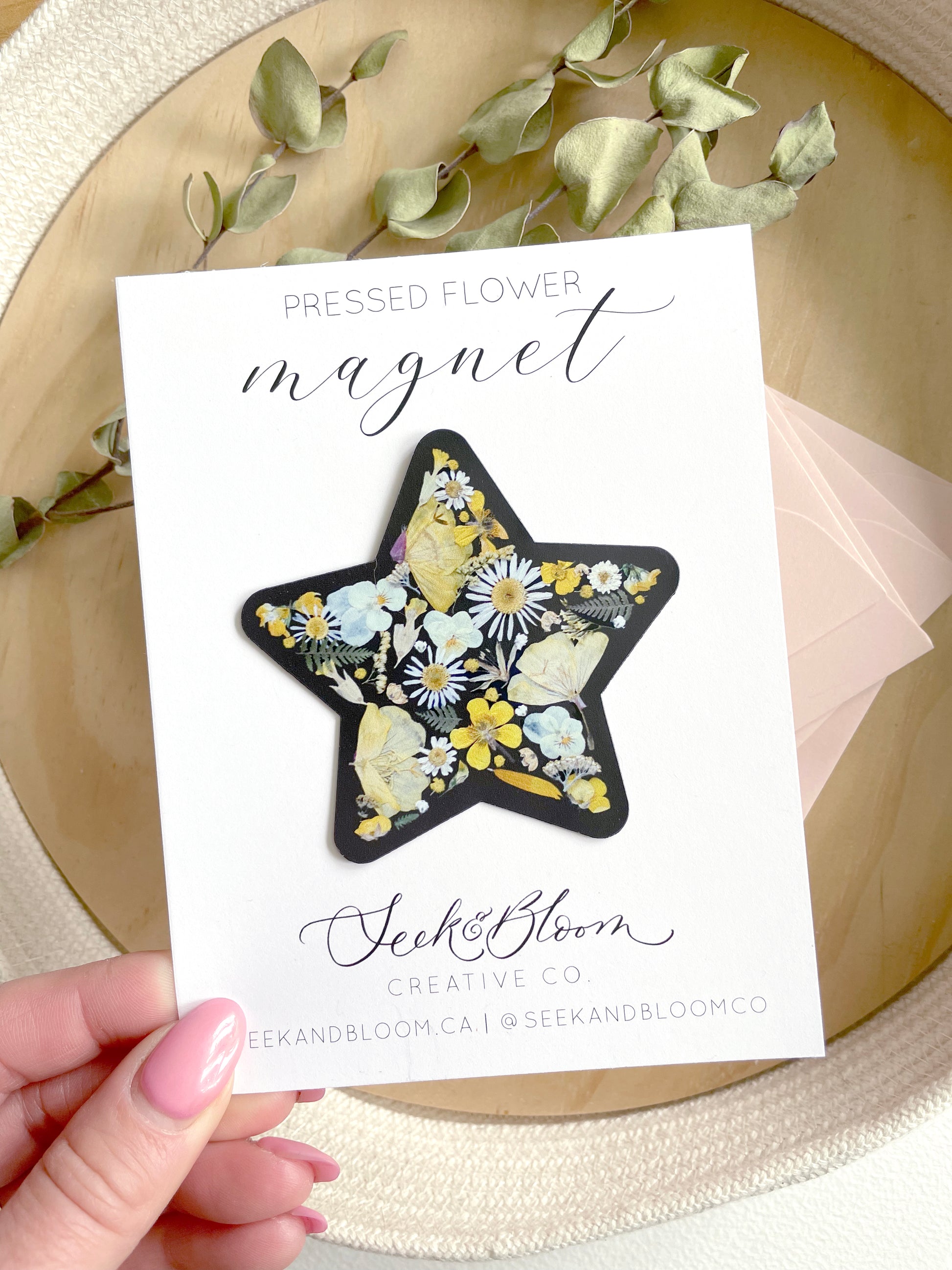 Pressed Flower Yellow Floral Star on black background, Art Magnet.