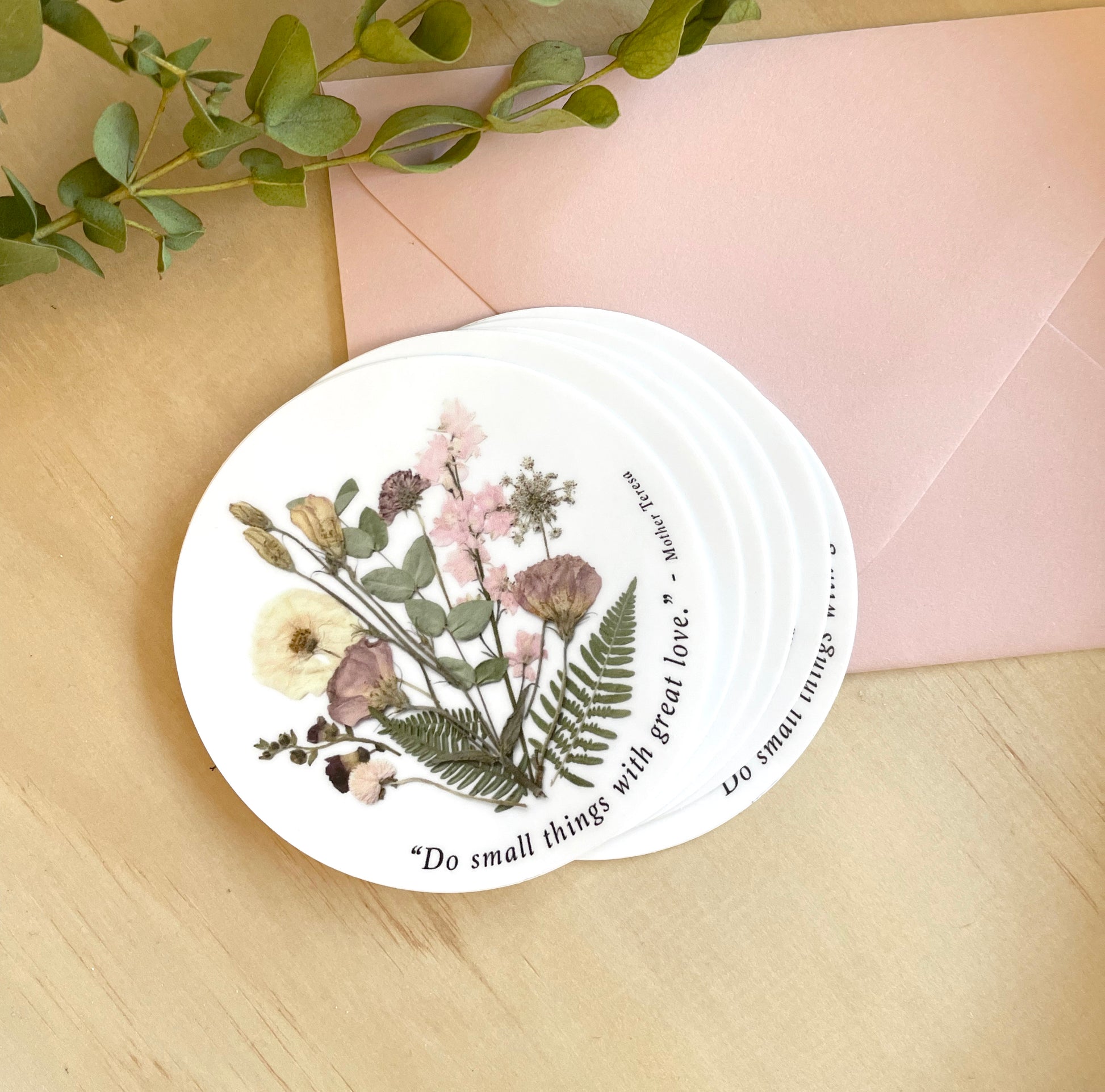 Pressed Flower sticker with a quote: "Do small things with great love." - Mother Theresa