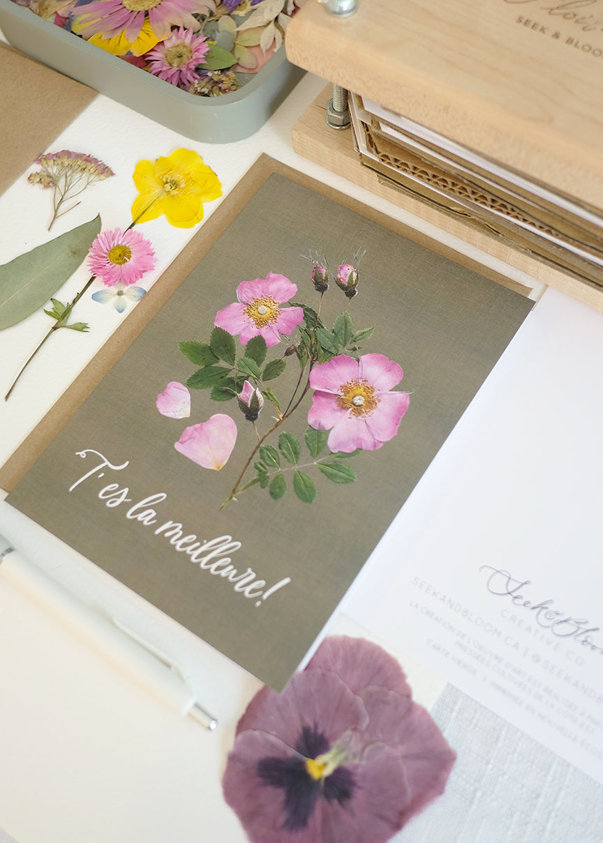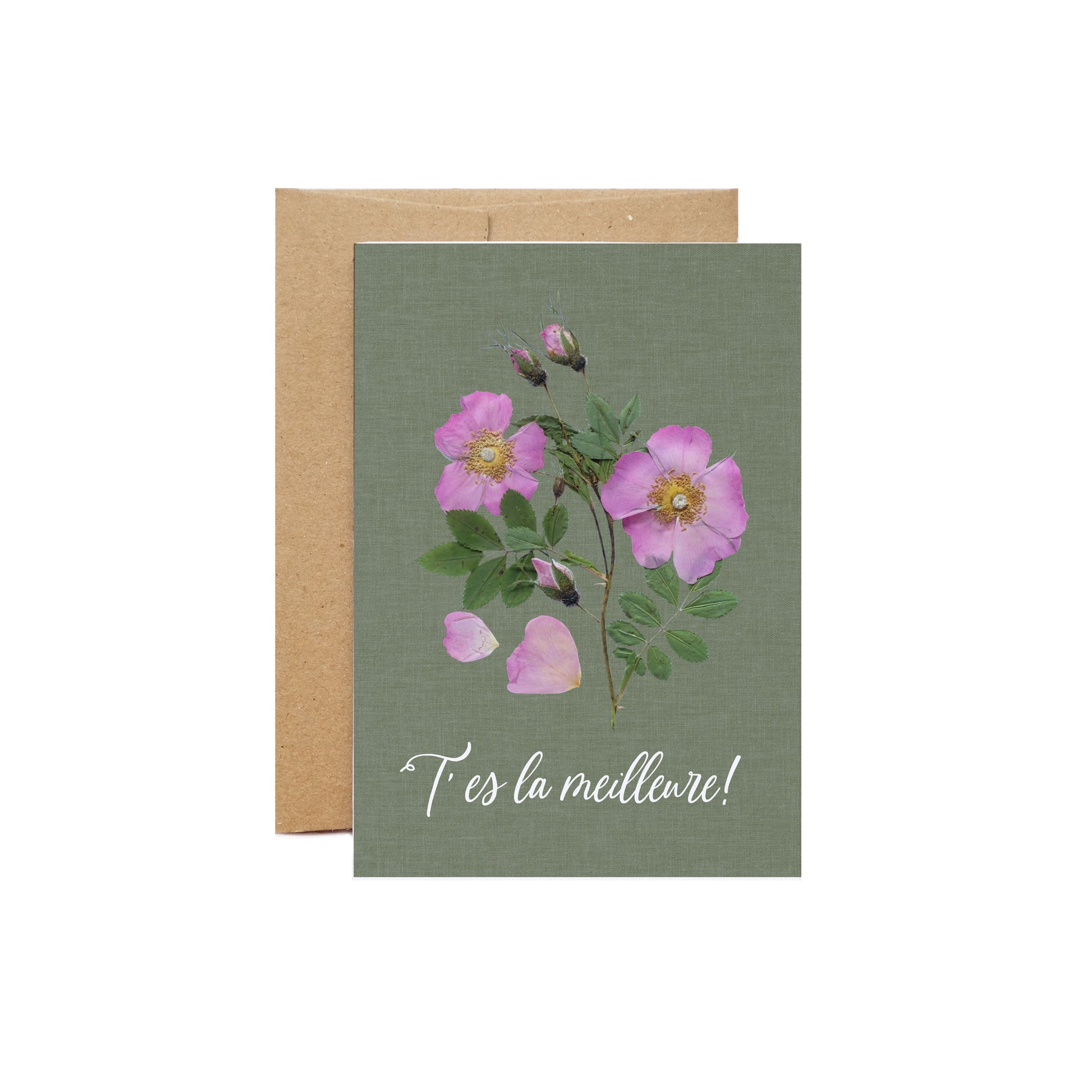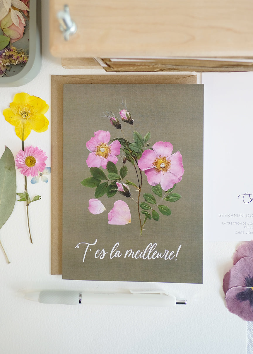 T'es la meilleure, Pressed Flower wild rose with green linen background, perfect for expressing gratitude and thanks for something special.