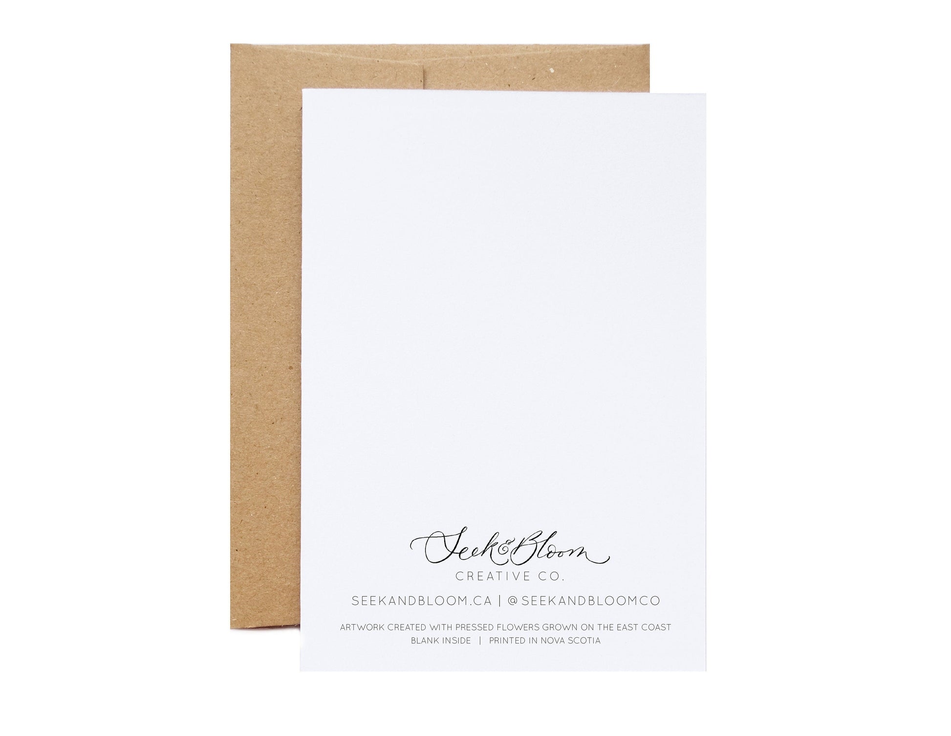 Seek & Bloom's artwork is created with pressed flowers grown on the East Coast of Canada. Our prints and cards are digitally reproduced from the original hand-pressed flowers and professionally photographed to look authentic and organic.