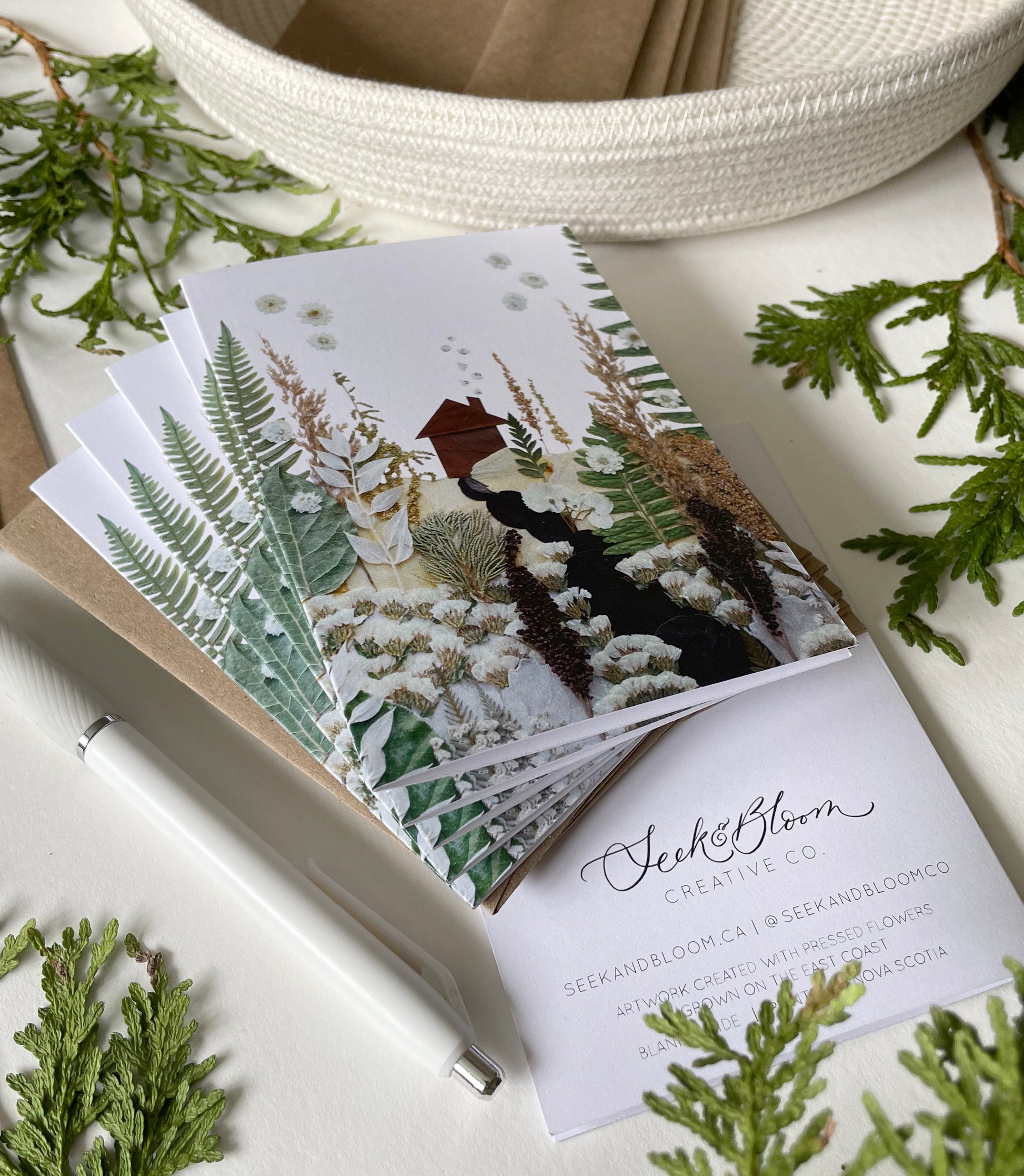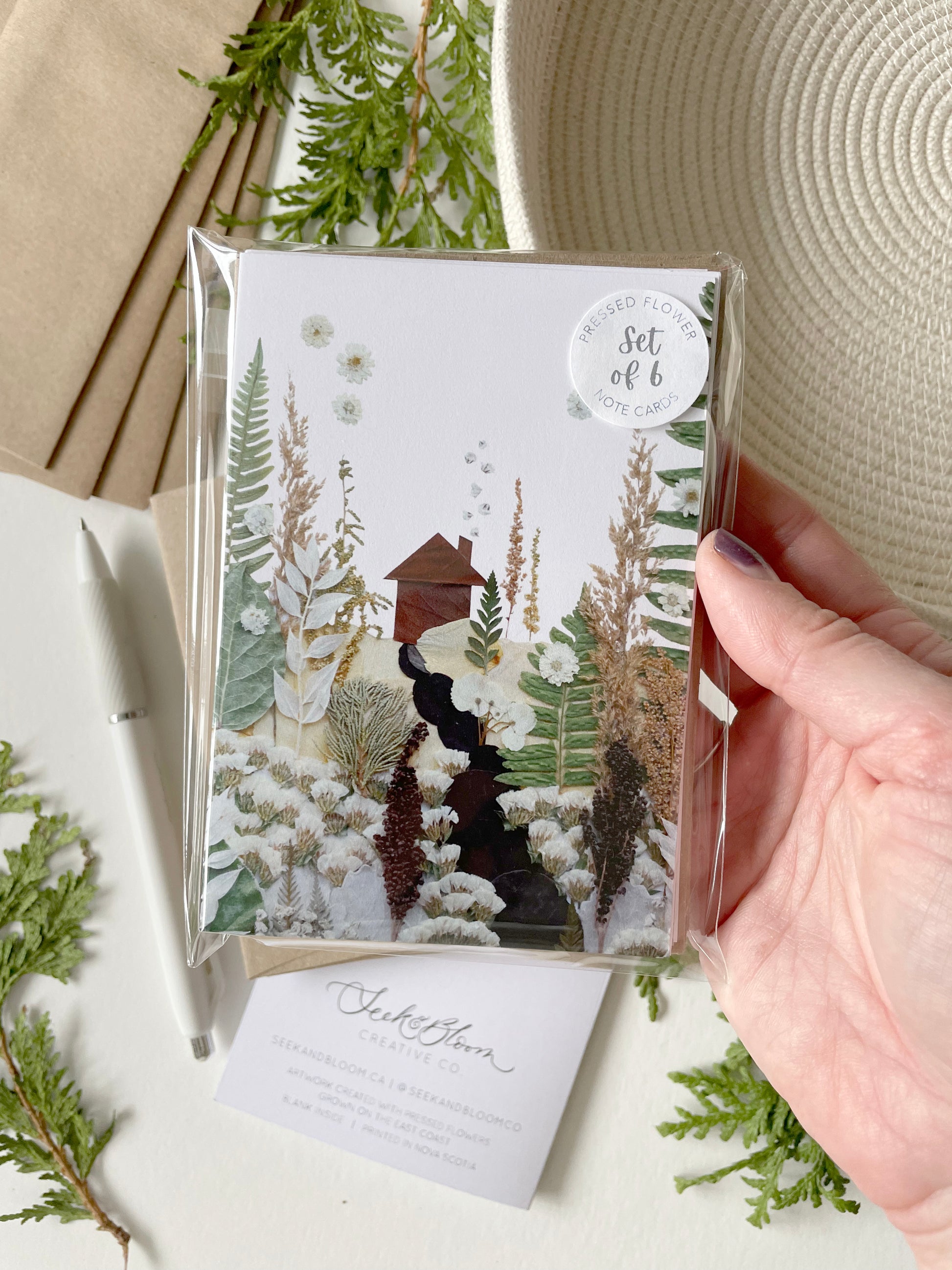 Crafted from dried flowers and leaves, this note card set captures the serene beauty of a snowy forest cabin. Share the warmth of the season and connect with the magic of nature with this rustic note card design.