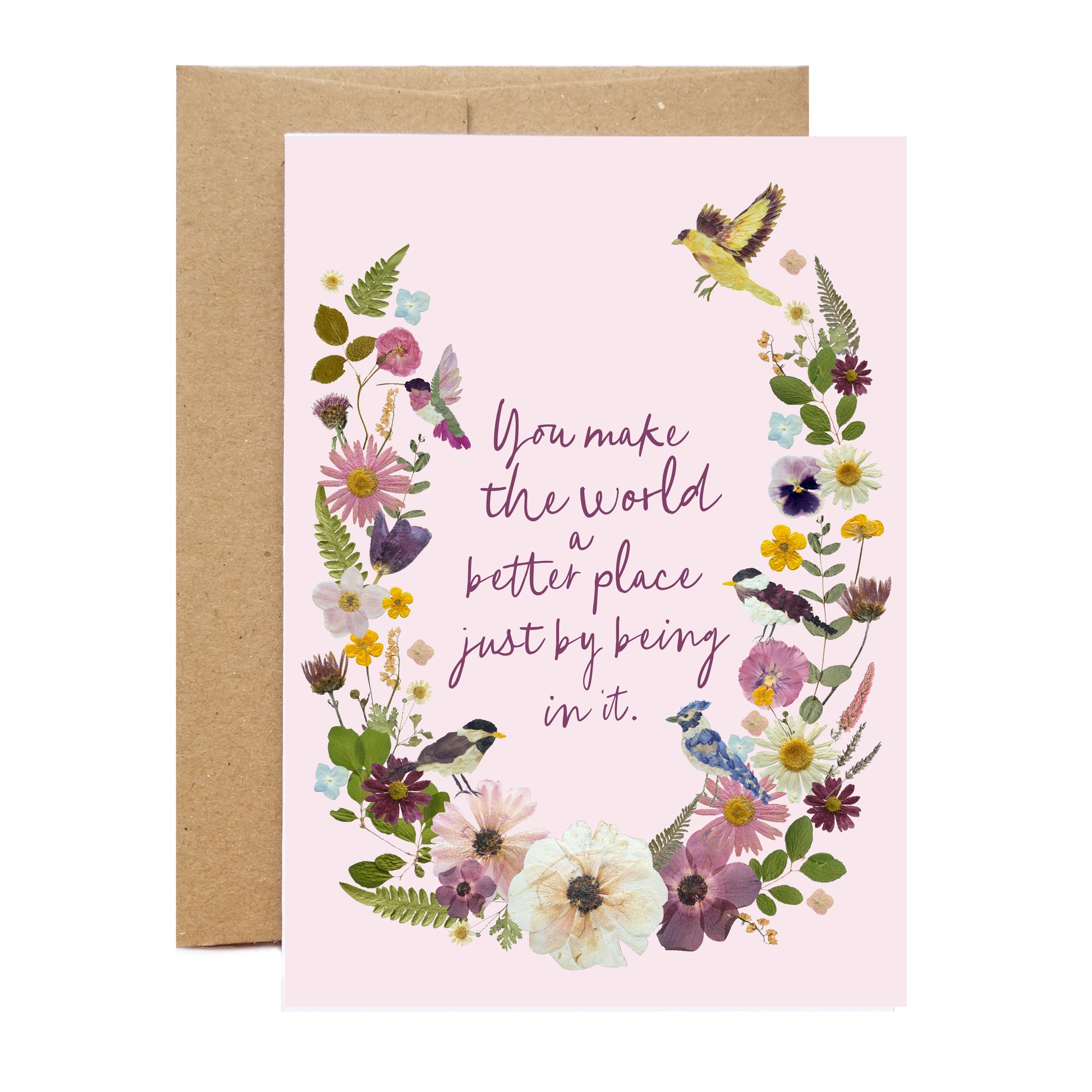 You Make the World A Better Place Just by Being in it. Everyday greeting card for friendship, love, Mother's day, birthdays and more! Featuring a whimsical, pressed flower art border with cute birds. The receiver will want to frame this card and keep it forever!