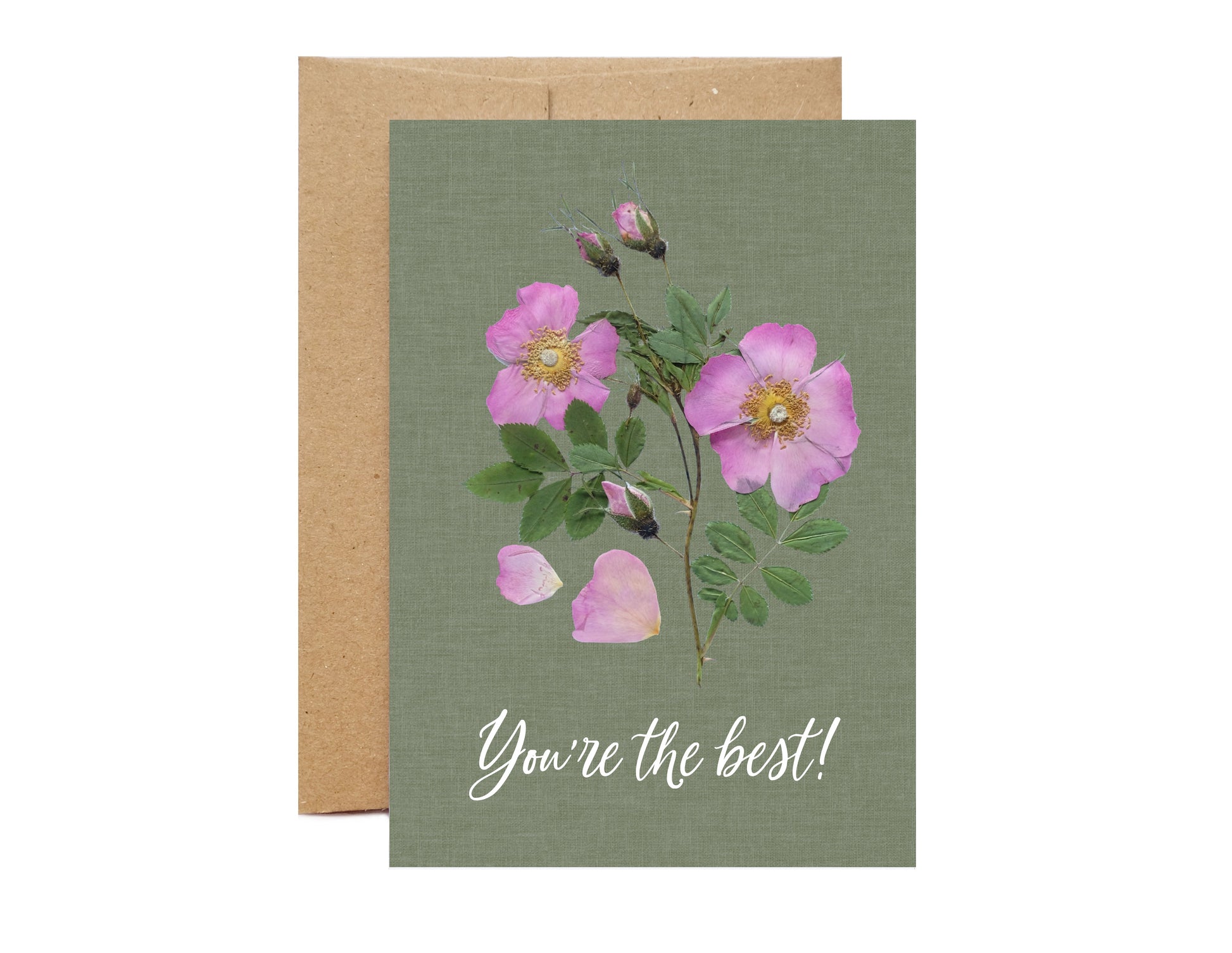 You're The Best, Pressed Flower wild rose with a green linen background, perfect for expressing gratitude and thanks for something special.
